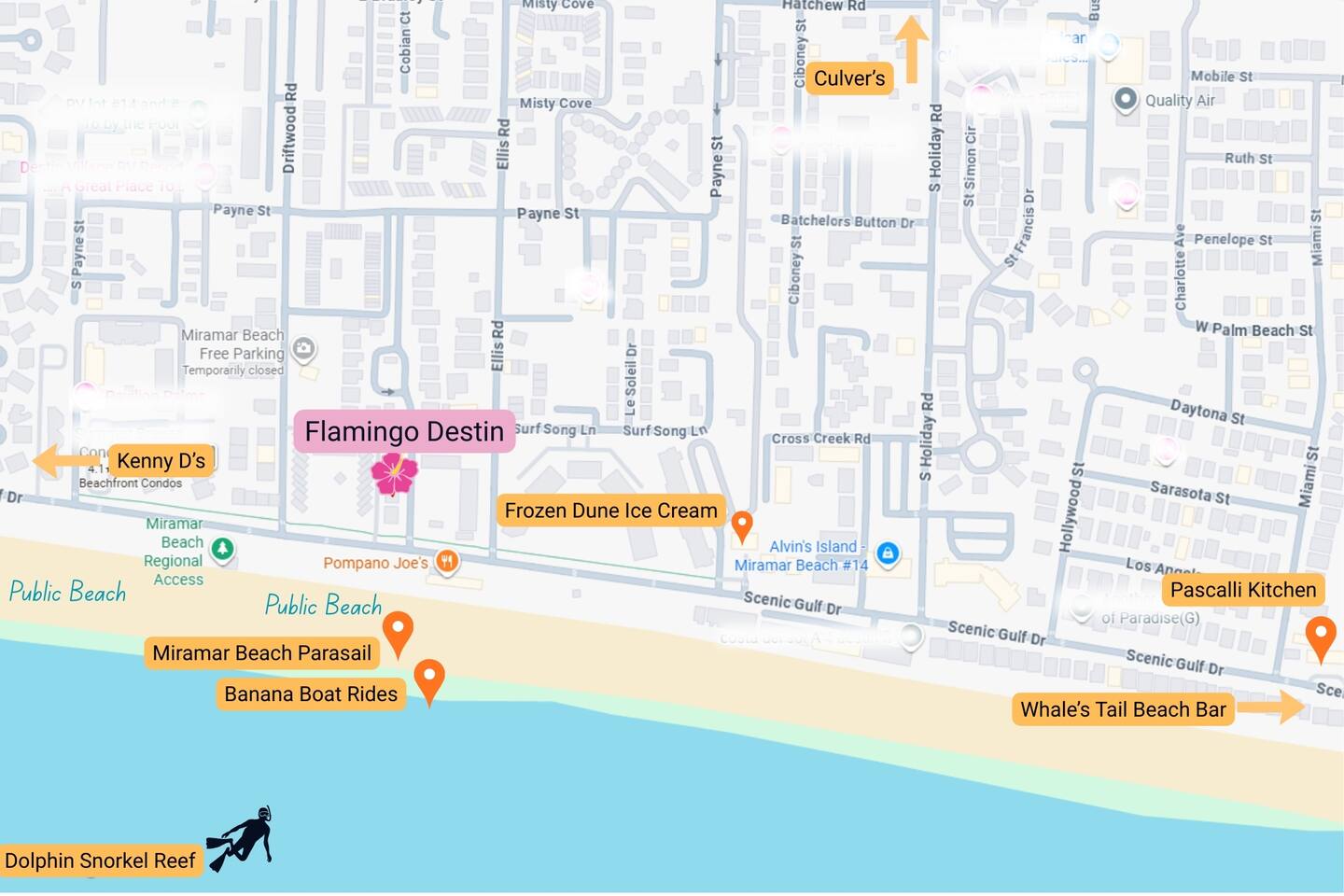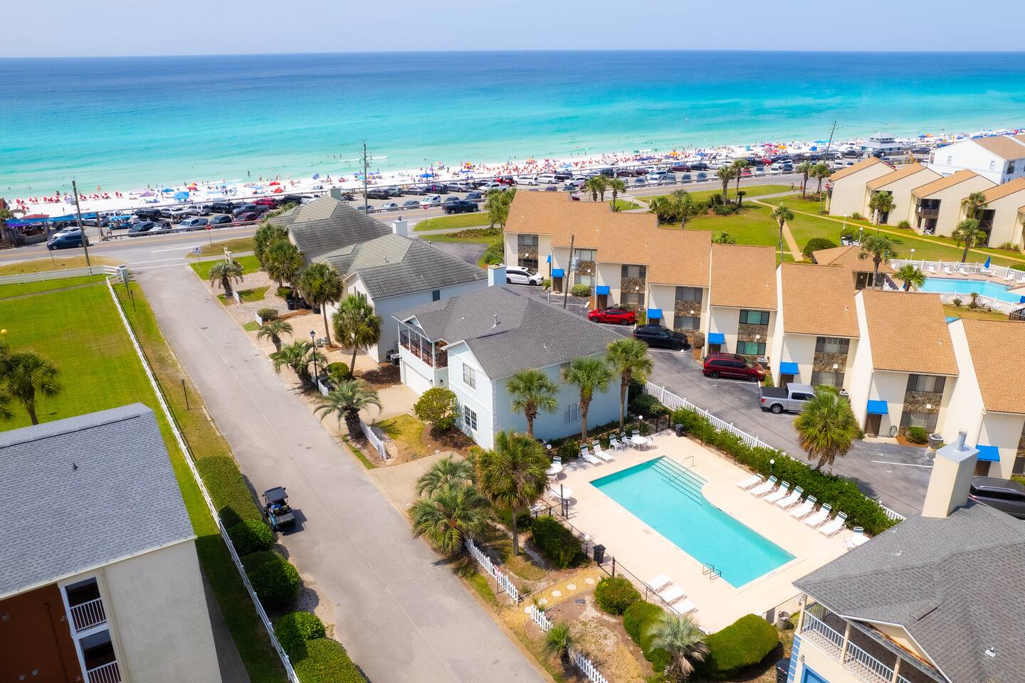 Port-of-Call is a quiet, family-friendly community of 4 homes located off Scenic 98, right across the street from Miramar Beach and Pompano Joe's. The quickest way to get to Hwy 98 is to take a right on Scenic 98 and then another right on Driftwood. The community offers a private pool which is only 50 steps away, practically next door! Our location on Scenic 98 is ideal for exploring the area, with easy access to all your favorite local attractions.