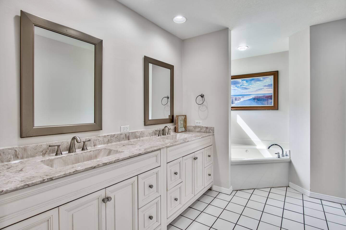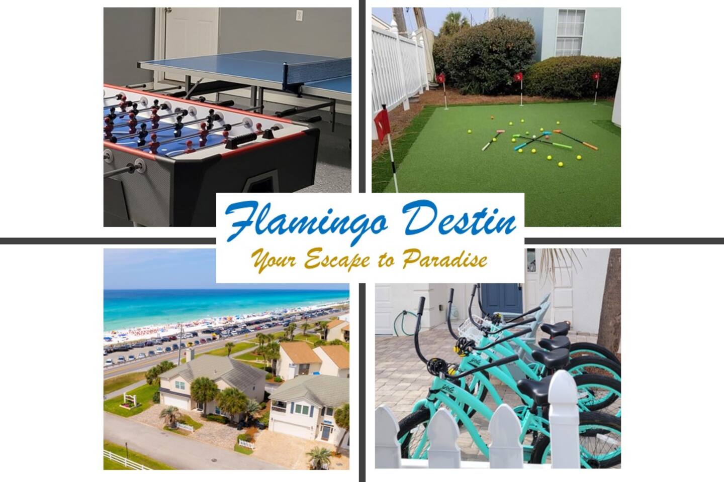 EXPERIENCE COASTAL LIVING ON THE EMERALD COAST When you choose to stay at FLAMINGO DESTIN, you're invited to truly live like a local while enjoying all the comforts of home. Our property is designed to offer you an authentic coastal experience, combining popular amenities with the laid-back atmosphere of the area. BREATHTAKING VIEWS Wake up to the beauty of the Emerald Coast with stunning sunrise and sunset views, visible each day from our south-facing balconies. These picturesque moments set the perfect backdrop for your stay, making every morning and evening unforgettable. IDEAL LOCATION FOR GROUPS AND FAMILIES This isn't just a beach getaway; it's a gateway to family bonding, group adventures, and unforgettable memories, no matter the time of year you visit. Whether you're seeking sun-soaked summer days, serene winter escapes, or the beauty of the in-between seasons, Flamingo Destin promises an unparalleled experience for families and groups of friends. Indulge in the comfort and space of this expansive home offering 6 bedrooms, including 4 King rooms, each with its own private bath. 🔹The main KING BEDROOM on the second floor has an ensuite bath with a soaking tub and walk-in shower, plus a private balcony with stunning sunrise views of the Gulf. 🔹The three additional KING BEDROOMS on the second floor each include a private bathroom. 🔹The first floor has two additional bedrooms, each with one QUEEN bed and one TWIN over FULL bunk bed. NOTE: All bedrooms include a TV, ensuring your end-of-the-day relaxation is just a remote click away. The KITCHEN boasts modern stainless-steel appliances. A generously sized refrigerator offers ample space to store your fresh ingredients and delicious leftovers. We've stocked various dishes, utensils, and cooking equipment to ensure you have everything to whip up a beach picnic, cozy dinner or holiday feast. The DINING AREA has seating for 10+ with two tables. Plus, there's additional kitchen counter seating for 2. Relax in the spacious LIVING AREA as you catch up on your favorite shows, movies or the big game on the large-screen TV. When you're not enjoying the beach, head over to the community POOL, just steps from the house. Perfect for an early morning swim or to keep the kiddos occupied for a while after the day’s adventures. (Our pool is shared by only 4 houses) For even more hours of fun, venture into the dedicated GAME ROOM featuring foosball, card games, ping pong, and more. The perfect gathering space for friendly competitions and shared laughter. Let the kiddos hang out all evening while the grownups enjoy drinks on the patio or sunset views on the balcony. Unwind on our private outdoor patio, complete with a large table, plenty of seating, and a natural gas grill. Savor your meals as you enjoy the fresh ocean breeze with the picturesque backdrop of the white sand and tranquil gulf waters. BEACH ADVENTURES MADE EASY Being just a stone's throw away from the beach, we've provided everything you need for a day of coastal exploration. Jump on our complimentary bikes and cruise along the shoreline, or load up our convenient beach wagon with all the essentials (cooler and chairs available onsite). Your beach days have never been more comfortable and enjoyable. Renting a GOLF CART? Let us know and we'll pass along a Promo Code from our favorite local vendor worth 15% off your rental! YOUR NEXT BEACH ESCAPE AWAITS Flamingo Destin is more than just a place to stay—it’s a peaceful escape from everyday life. Take the opportunity to relax and recharge in comfort, surrounded by the tranquil sights and sounds of the coast. Discover your own slice of paradise as you unwind and enjoy everything the Emerald Coast has to offer.