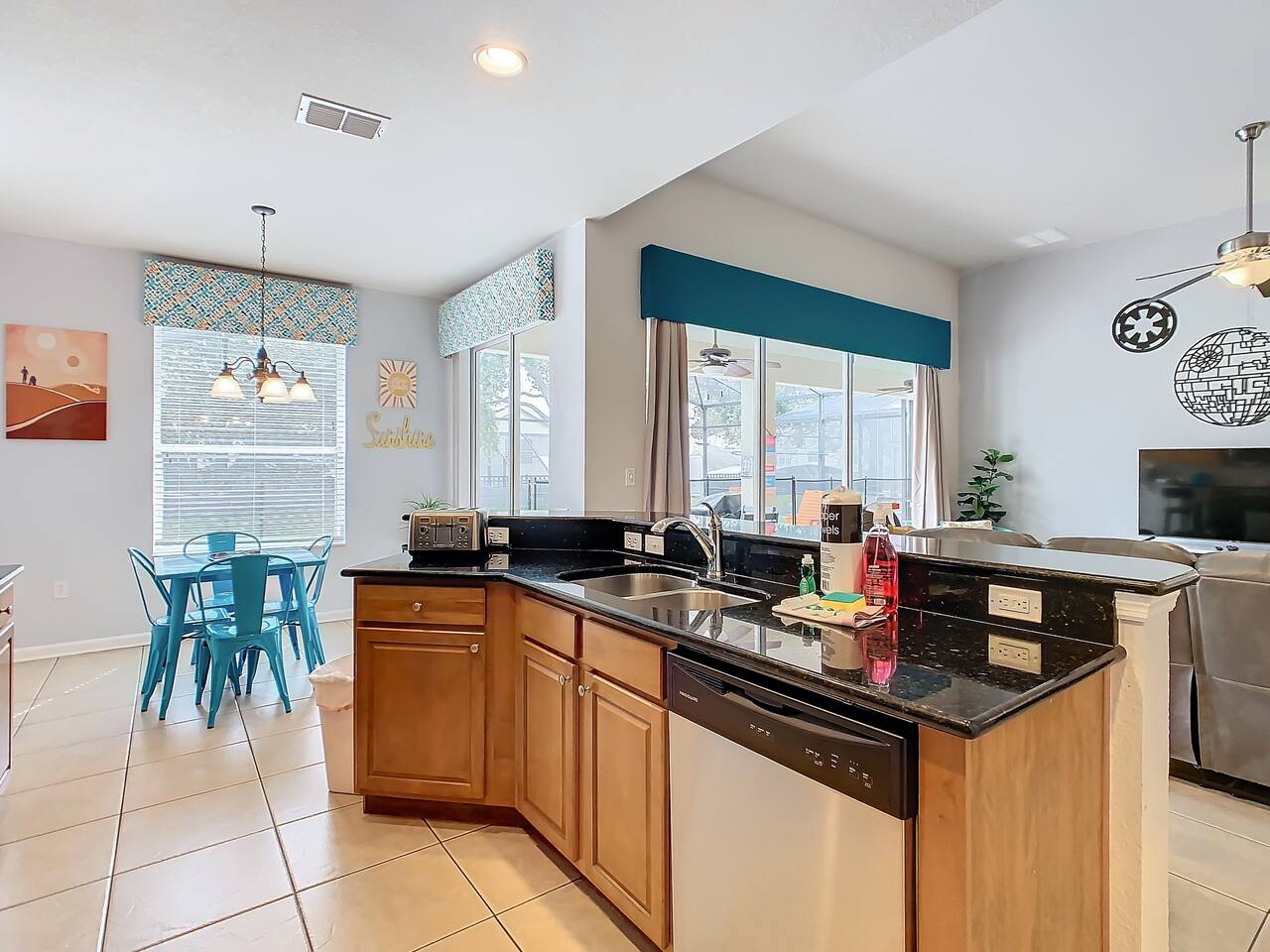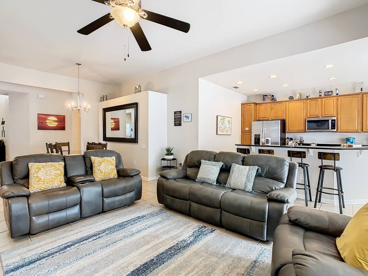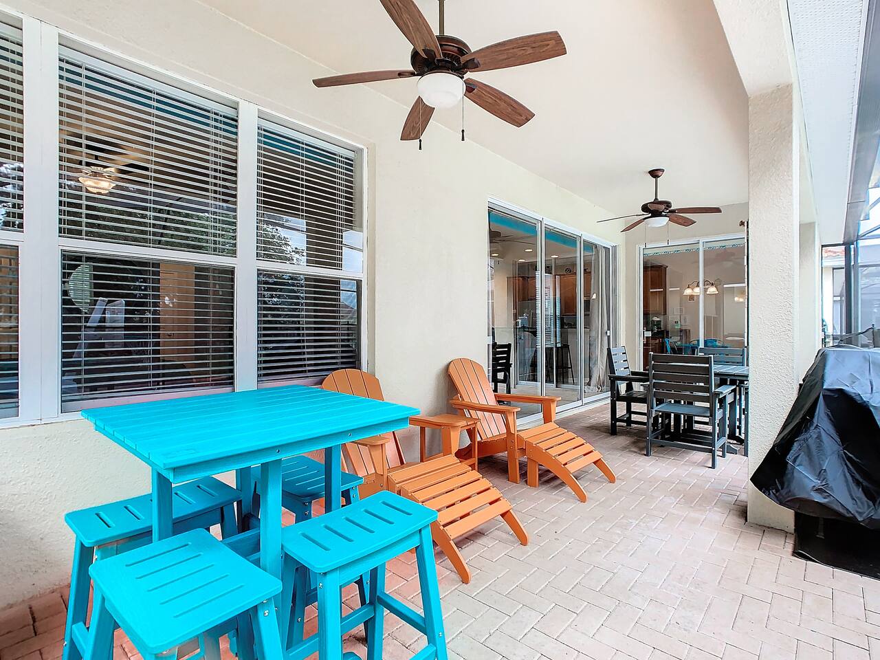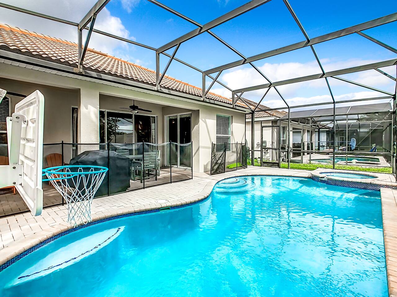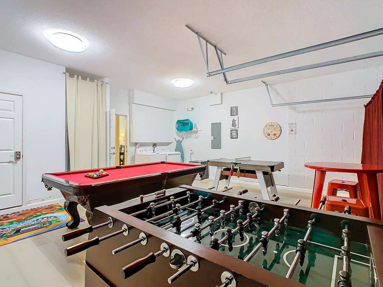 ABOUT BRIGHT SUNS GETAWAY... On the FIRST FLOOR you'll find a spacious open floor plan that leads from the front foyer entrance to your private backyard oasis. •The LIVING AREA is tastefully decorated and furnished with plush seating and a Smart TV for streaming your favorite movies. As you enter this area, you'll be greeted with an amazing view of your private lanai from the wide ceiling-to-floor windows. •The elegant DINING ROOM includes a table that easily seats 8 and is located between the kitchen and living area, making it the perfect place for family gatherings •The fully-stocked KITCHEN includes all your favorite small appliances, countertop seating, and a cozy eating area that leads out to the covered lanai. •The garage has been repurposed as a family-friendly GAME ROOM...the perfect place to enjoy some friendly competition and work off some energy! Enjoy a game of pool or foosball in this air-conditioned space. And the littles in your group will LOVE the play area we've added just for them! •The first floor also has TWO King bedroom suites and one bedroom with a trundle bed. * * * * * All BEDROOMS have private bathrooms, Smart TVs with Roku, ceiling fans, and inviting, comfortable beds. It's like having your own private retreat! (3) KING Ensuite Bedrooms (2 on the first floor, 1 on the second floor) (1) TWIN Ensuite Bedroom with 3 Twin Beds (located on the 2nd floor) (1) FULL Ensuite Bedroom, with TWIN Trundle Bed (locate on the 1st floor) The garage area has been renovated as a family-friendly, air-conditioned GAME ROOM and is quite popular among our guests. Enjoy a game of Foosball or a round of Pool, while the littles hang out in a special play area just for them. Enjoy a little friendly competition at our combination Ping Pong and Air Hockey gaming table. The perfect place to work off some energy! WAIT THERE'S MORE! Our house is conveniently located within a short walking distance of TWO PLAYGROUNDS! The first is right across the street from our house, with a large common area that's perfect for a game of soccer or kickball. The second is just 4 houses away at the corner of our street and Teascone Blvd.