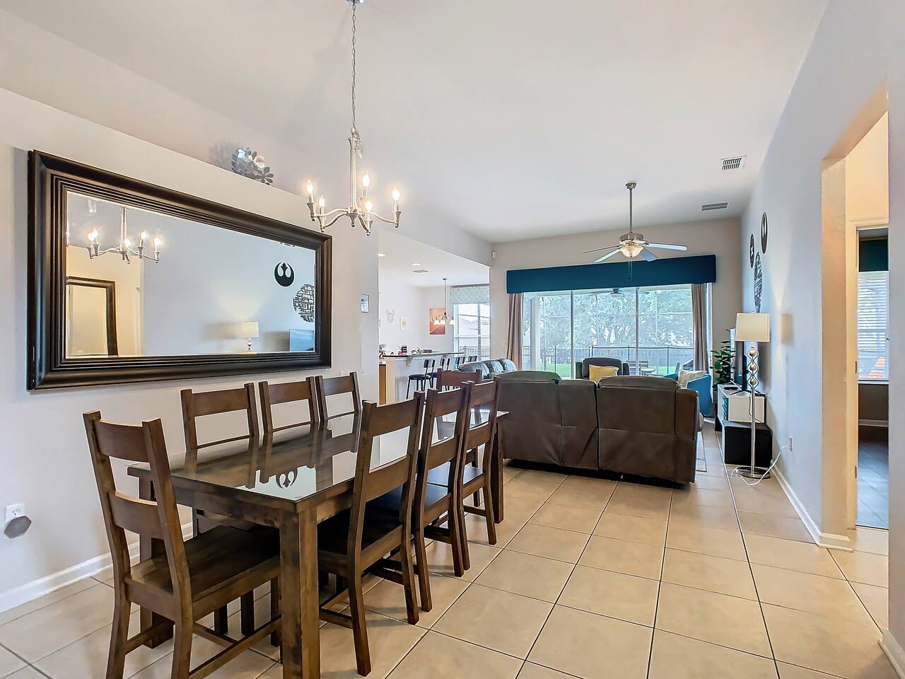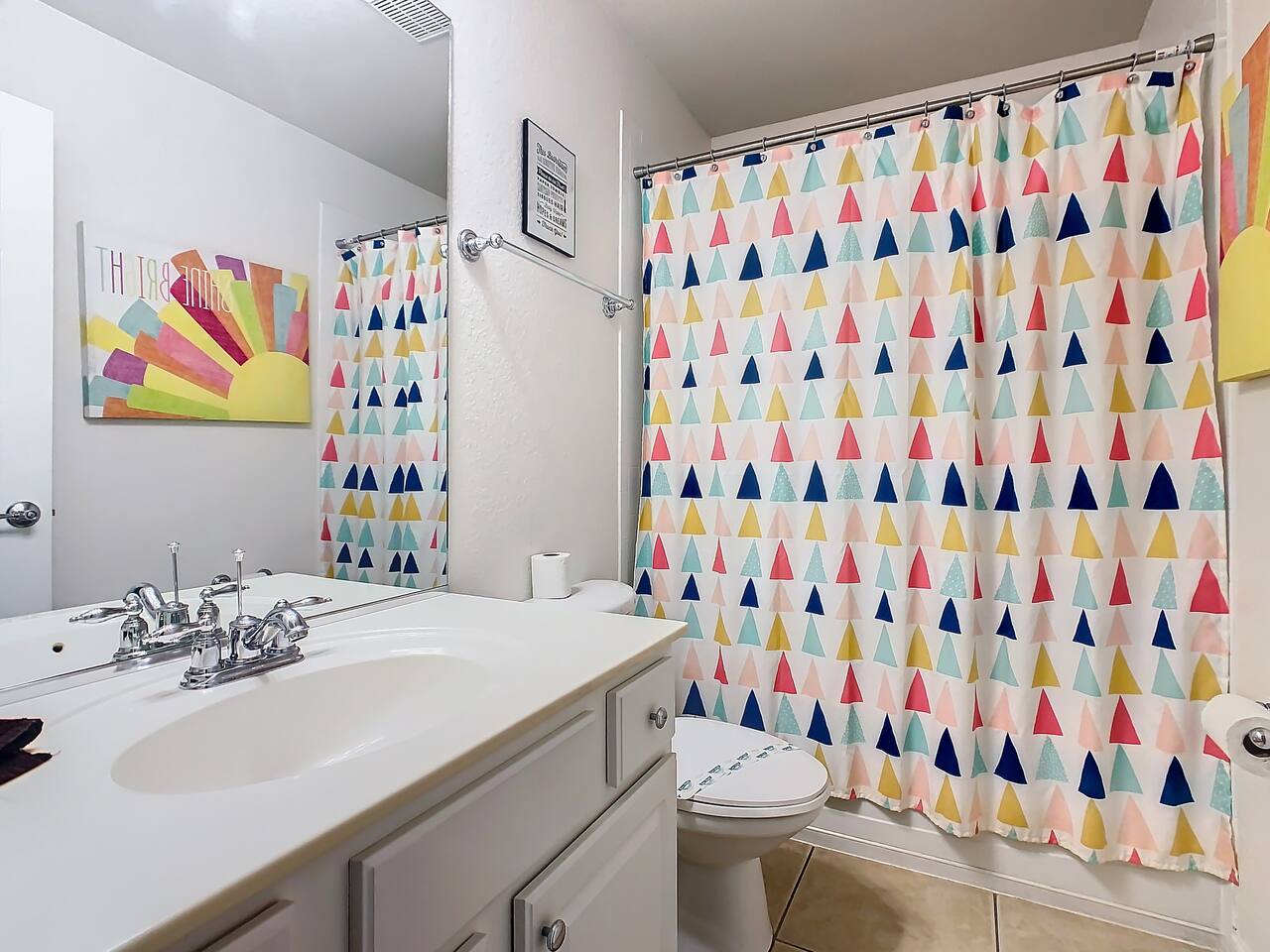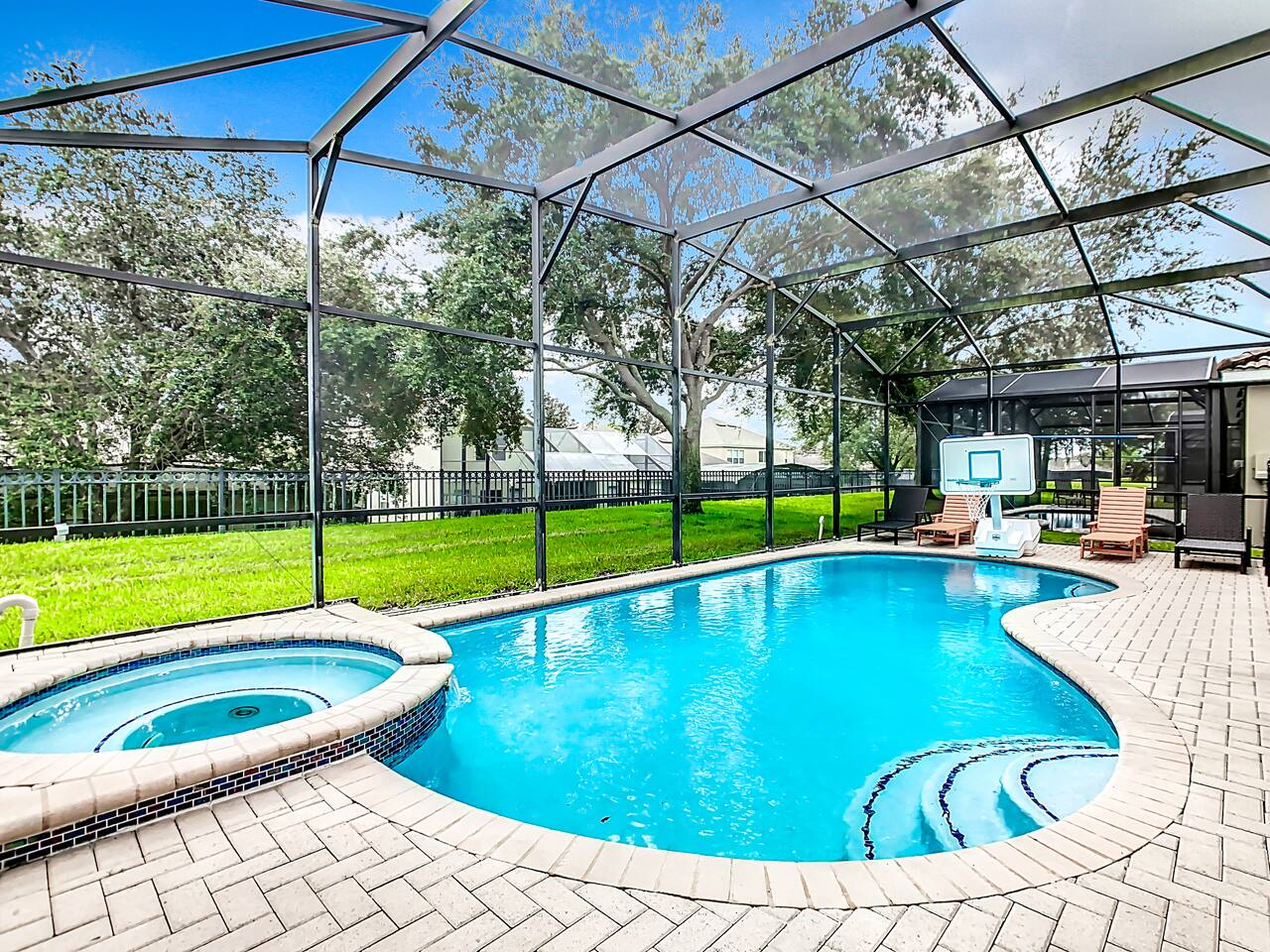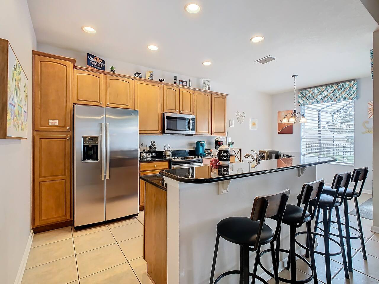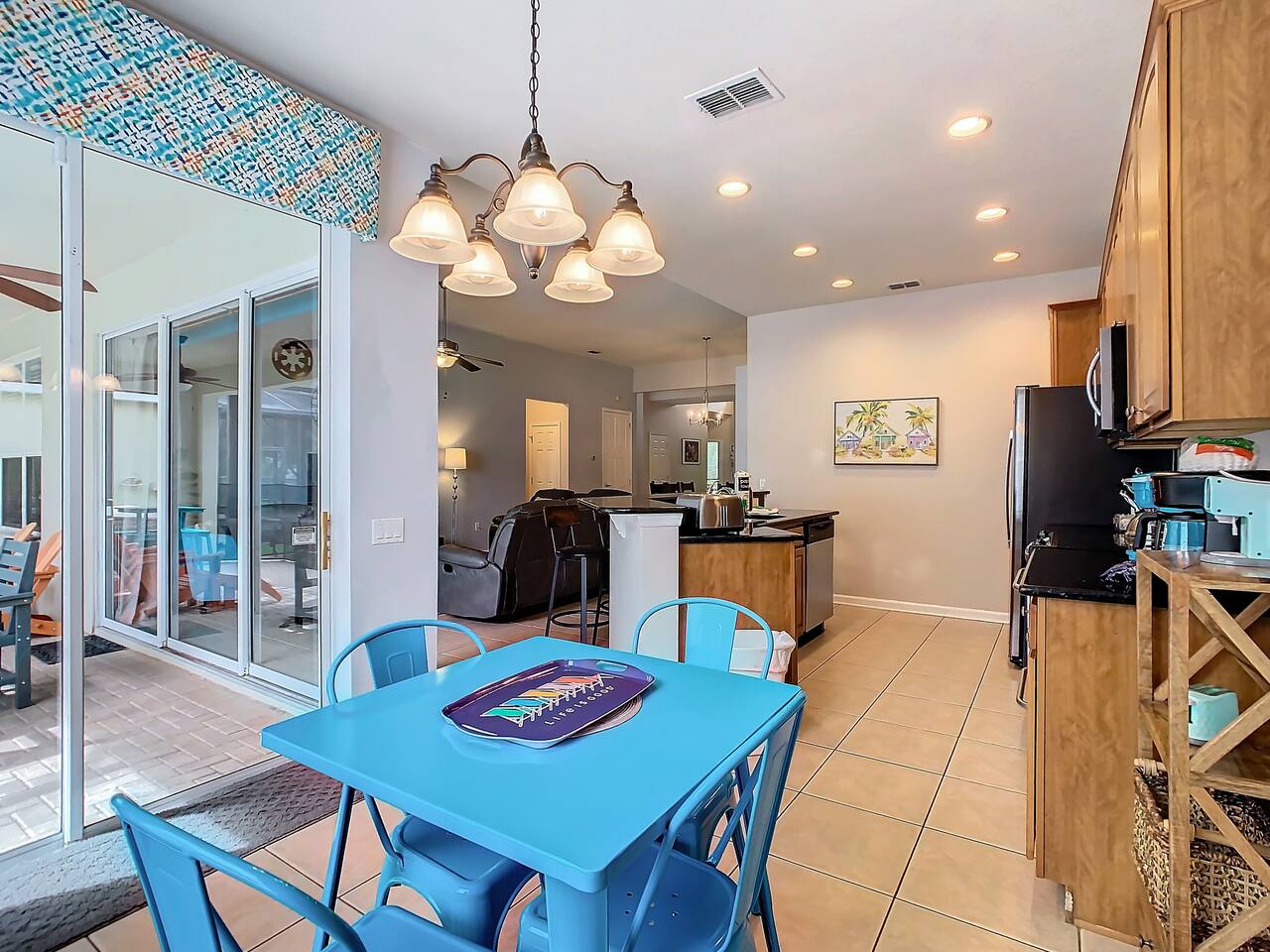 ABOUT BRIGHT SUNS GETAWAY... On the FIRST FLOOR you'll find a spacious open floor plan that leads from the front foyer entrance to your private backyard oasis. •The LIVING AREA is tastefully decorated and furnished with plush seating and a Smart TV for streaming your favorite movies. As you enter this area, you'll be greeted with an amazing view of your private lanai from the wide ceiling-to-floor windows. •The elegant DINING ROOM includes a table that easily seats 8 and is located between the kitchen and living area, making it the perfect place for family gatherings •The fully-stocked KITCHEN includes all your favorite small appliances, countertop seating, and a cozy eating area that leads out to the covered lanai. •The garage has been repurposed as a family-friendly GAME ROOM...the perfect place to enjoy some friendly competition and work off some energy! Enjoy a game of pool or foosball in this air-conditioned space. And the littles in your group will LOVE the play area we've added just for them! •The first floor also has TWO King bedroom suites and one bedroom with a trundle bed. * * * * * All BEDROOMS have private bathrooms, Smart TVs with Roku, ceiling fans, and inviting, comfortable beds. It's like having your own private retreat! (3) KING Ensuite Bedrooms (2 on the first floor, 1 on the second floor) (1) TWIN Ensuite Bedroom with 3 Twin Beds (located on the 2nd floor) (1) FULL Ensuite Bedroom, with TWIN Trundle Bed (locate on the 1st floor) The garage area has been renovated as a family-friendly, air-conditioned GAME ROOM and is quite popular among our guests. Enjoy a game of Foosball or a round of Pool, while the littles hang out in a special play area just for them. Enjoy a little friendly competition at our combination Ping Pong and Air Hockey gaming table. The perfect place to work off some energy! WAIT THERE'S MORE! Our house is conveniently located within a short walking distance of TWO PLAYGROUNDS! The first is right across the street from our house, with a large common area that's perfect for a game of soccer or kickball. The second is just 4 houses away at the corner of our street and Teascone Blvd.