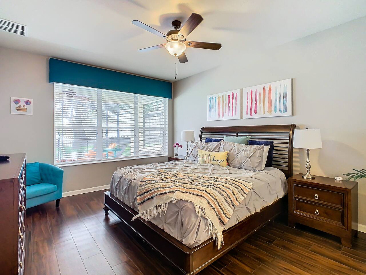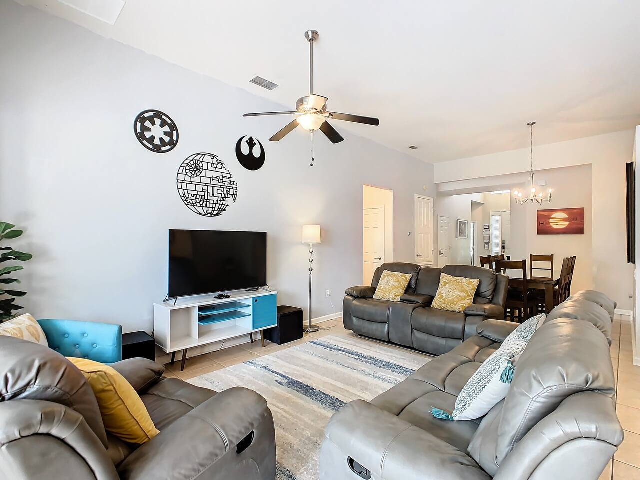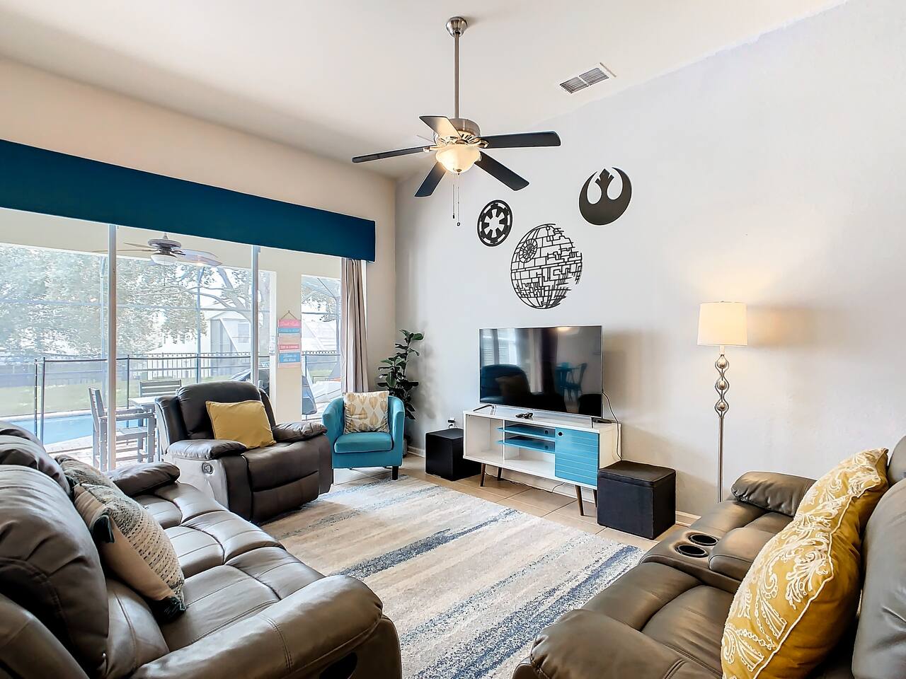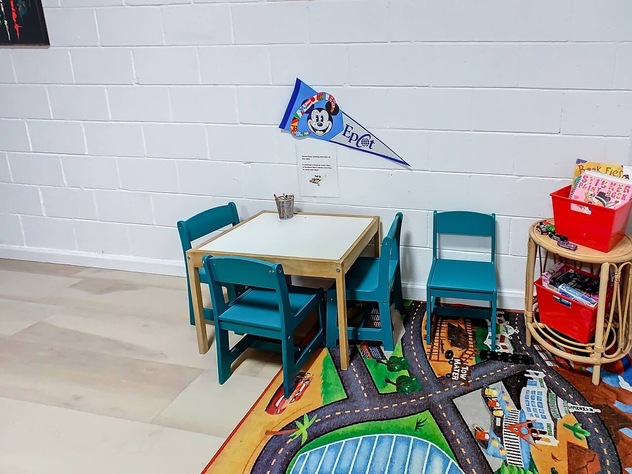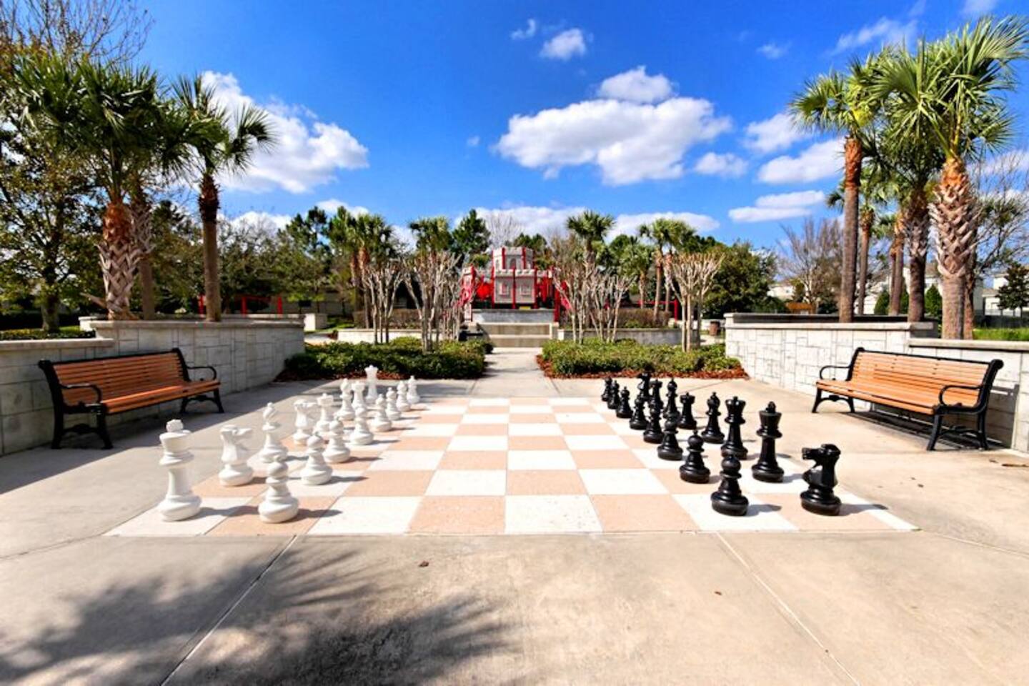 ABOUT BRIGHT SUNS GETAWAY... On the FIRST FLOOR you'll find a spacious open floor plan that leads from the front foyer entrance to your private backyard oasis. •The LIVING AREA is tastefully decorated and furnished with plush seating and a Smart TV for streaming your favorite movies. As you enter this area, you'll be greeted with an amazing view of your private lanai from the wide ceiling-to-floor windows. •The elegant DINING ROOM includes a table that easily seats 8 and is located between the kitchen and living area, making it the perfect place for family gatherings •The fully-stocked KITCHEN includes all your favorite small appliances, countertop seating, and a cozy eating area that leads out to the covered lanai. •The garage has been repurposed as a family-friendly GAME ROOM...the perfect place to enjoy some friendly competition and work off some energy! Enjoy a game of pool or foosball in this air-conditioned space. And the littles in your group will LOVE the play area we've added just for them! •The first floor also has TWO King bedroom suites and one bedroom with a trundle bed. * * * * * All BEDROOMS have private bathrooms, Smart TVs with Roku, ceiling fans, and inviting, comfortable beds. It's like having your own private retreat! (3) KING Ensuite Bedrooms (2 on the first floor, 1 on the second floor) (1) TWIN Ensuite Bedroom with 3 Twin Beds (located on the 2nd floor) (1) FULL Ensuite Bedroom, with TWIN Trundle Bed (locate on the 1st floor) The garage area has been renovated as a family-friendly, air-conditioned GAME ROOM and is quite popular among our guests. Enjoy a game of Foosball or a round of Pool, while the littles hang out in a special play area just for them. Enjoy a little friendly competition at our combination Ping Pong and Air Hockey gaming table. The perfect place to work off some energy! WAIT THERE'S MORE! Our house is conveniently located within a short walking distance of TWO PLAYGROUNDS! The first is right across the street from our house, with a large common area that's perfect for a game of soccer or kickball. The second is just 4 houses away at the corner of our street and Teascone Blvd.