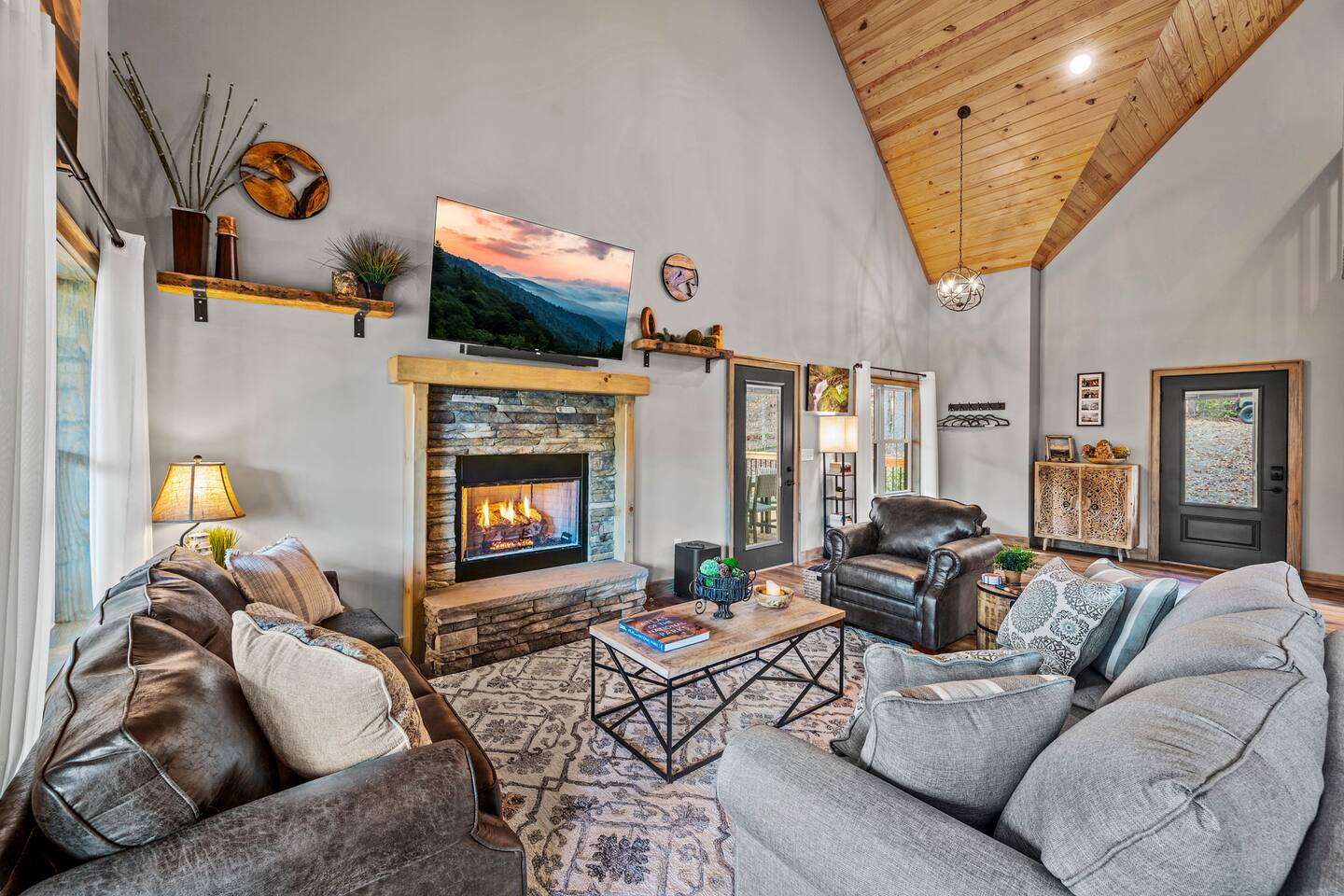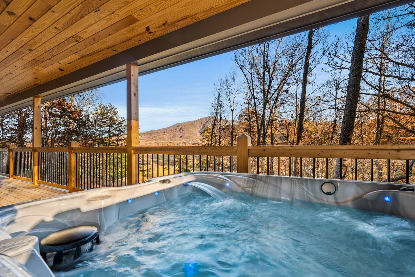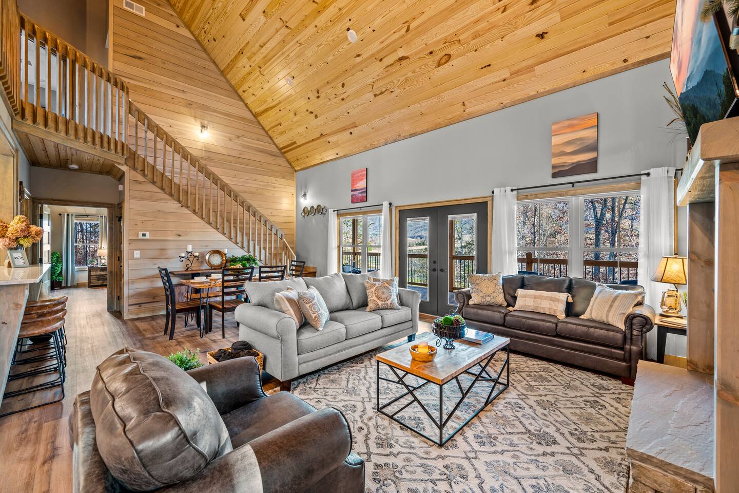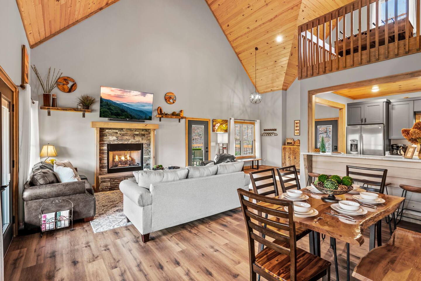 ABOUT OUR CABIN... As you enter the cabin, you'll see a GOURMET KITCHEN to the left and an open living space directly ahead. You'll be welcomed by large picture windows, offering breathtaking panoramic views of the beautiful mountains surrounding Wears Valley. UPSCALE DECOR...Throughout the cabin you'll find exceptional canvas art photography by Bill Lea, a National Geographic photographer and local resident. All furnishings and amenities are NEW since opening our doors in December 2023 and purchased from local artisans and vendors. LIVING ROOM: Gather with friends and loved ones in this spacious room, with amazing views of the surrounding mountains. As you relax on comfortable leather and fabric sofas, you'll enjoy our 65" 4K Smart ROKU TV, equipped with a JBL Soundbar and Subwoofer for an immersive sound experience. Perfect for streaming your favorite shows or movies. On cooler nights, relax in this comfortable room in front of the gas fireplace under the cozy throws provided. The sleeper sofa in this room provides an extra Queen bed. You'll find all the necessary pillows, and bedding in the mango wood cabinet in the entryway. KITCHEN/DINING: The open floorplan leads to a cozy dining area adjacent to the living room. The dining table offers 4 chairs and a dining bench that easily seats 6-7. The nearby kitchen bar has 4 stools, for additional seating. A booster seat can be found in the laundry room for our younger guests. The gourmet kitchen is equipped with Caphalon Select cookware as well as an All-Clad Turkey Roaster big enough for cooking a 25-lb turkey for the holidays! In addition, you'll find all your favorite small appliances like a waffle maker, blender, crock pot, and rice cooker. Complimentary pantry items include a small supply of K-cups and Tea, coffee filters, Sugar, Salt, Pepper, Cooking Oil, Pam Spray, a variety of herbs and spices, Foil, Saran Wrap, Wax Paper, etc. Your family will have ample dishes, server ware, and utensils for meals or snacks. COMFORTABLE BEDROOMS (3): *KING Bedroom - This spacious FIRST FLOOR suite includes a private bathroom, six-drawer dresser, luggage rack, and 43-inch 4K ROKU TV for streaming your favorite shows/movies. Each of the bedside lamps is equipped with night lights and USB chargers. This room includes blackout curtains and a quiet ceiling fan for your comfort. French doors lead out to the deck, with panoramic views of Wears Valley. Note: The closet in this bedroom is reserved for the owners only. The private bathroom features a double sink, walk-in shower, and a free-standing soaking tub. Amenities include lush linens, a bath caddy, travel size soap, shampoo, and conditioner, and two rolls of toilet paper. *Queen Bedroom - This quiet SECOND FLOOR room offers a custom closet for storing your belongings, a luggage rack, and a 32-inch HD Smart ROKU TV for streaming your favorite shows/movies. The nightstands offer additional drawers for storage and lamps with night lights and USB chargers. The huge picture window is dressed with blackout curtains and looks out onto the valley and mountains. A private entrance to the SHARED hall bathroom reveals a spacious layout with double vanity and a shower/tub combo with a sliding shower door. *Twin Room - This cozy SECOND FLOOR room is furnished with two Twin Trundle beds, providing a total of four twin beds. Each bed has a Serta 3" DuoCool Gel Memory Foam mattress. Extra pillows and bedding can be found in the tufted cushion chest. Our younger guests will enjoy the cozy alcove that includes a sofa chair, reading lamp, books, cards, games, and puzzles. This room also has blackout curtains, a quiet ceiling fan, and a large closet for storing your belongings. NOTE: This room does NOT have a TV. *Queen Sleeper Sofa - On the lower level, you'll find a Queen sleeper sofa in the main living area. Bedding can be found in the mango chest located in the foyer. GAME ROOM-LOFT AREA: Your entire family will enjoy the game room located in the second floor loft area. Here you'll find a unique "cocktail style" Barrel Arcade with two chairs and loaded with 60 classic arcade games! This game room also includes a Foosball table, a wall-mounted Connect Four game, and several popular board and card games. It's the perfect place for Family Game Night or rainy day activities! OUTDOOR LIVING Our guests rave about the wrap-around, 958 sq ft deck offering panoramic views of Wears Valley and Cades Mountain. The covered deck includes a complimentary gas grill and a spacious Acacia wood dining table with seating for 6. The perfect place for a game of cards after dinner! Enjoy fireside chats into the night as you relax on cushioned furniture surrounding a gas FIRE PIT TABLE. The deck also offers a string of Edison lights (set on a timer to come on 5 pm to 11 pm daily). No stay is complete until you relax in the 3-person HOT TUB, situated in the corner with amazing views of the mountains. The hot tub is equipped with Bluetooth speakers and subwoofers; Waterfall Neck, Shoulder, Calf, and Foot Jets; Cushioned Headrests; and two reclining seats and a bench. ** Never run out of propane while grilling or enjoying the fire pit table. We are connected to a 100-gallon LP gas tank. OUTDOOR LAWN SPACE: Our sprawling 0.57 acre lot offers lots of space for your family to enjoy the outdoors! Start a Corn Hole tournament or bring along a ball and glove to play catch! In the afternoon, curl up in our double Hammock for a nap or enjoy a book from our complimentary outdoor library stand, stocked with reading material for all ages. Our guests rave about our wood-burning outdoor fireplace. Stop at the nearby gas station on your way to the house and pick up a couple bundles of wood for a relaxing evening by the fire. Its the perfect place to socialize with friends and family. (Four Adirondack chairs provided) WAIT THERE'S MORE... The first floor laundry room is equipped with a washer, dryer, iron, and ironing board. You'll also find a toddler booste