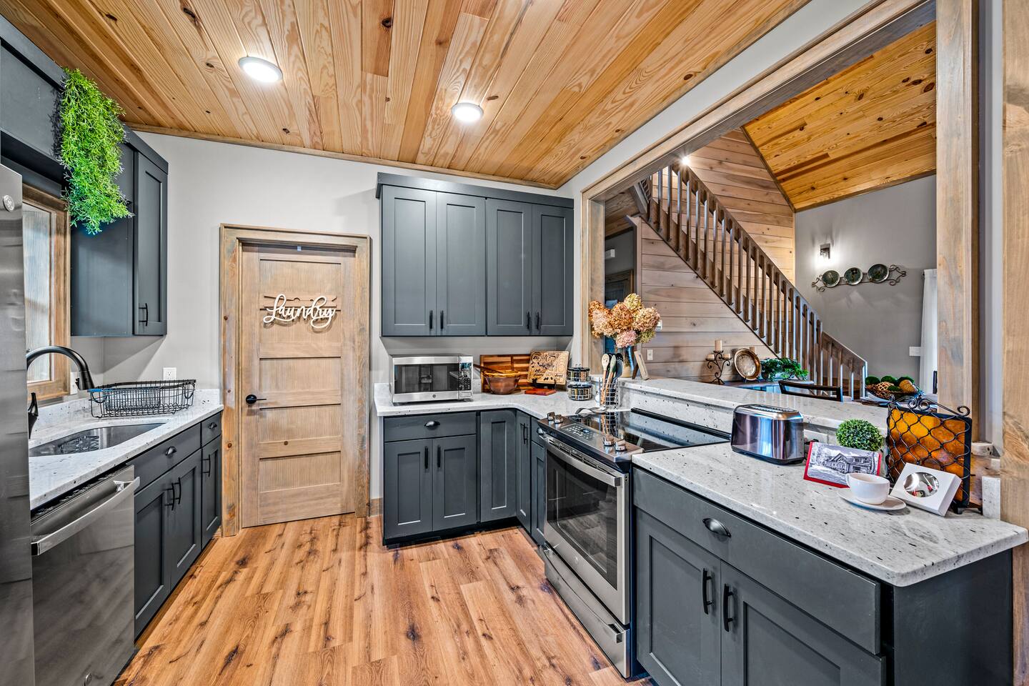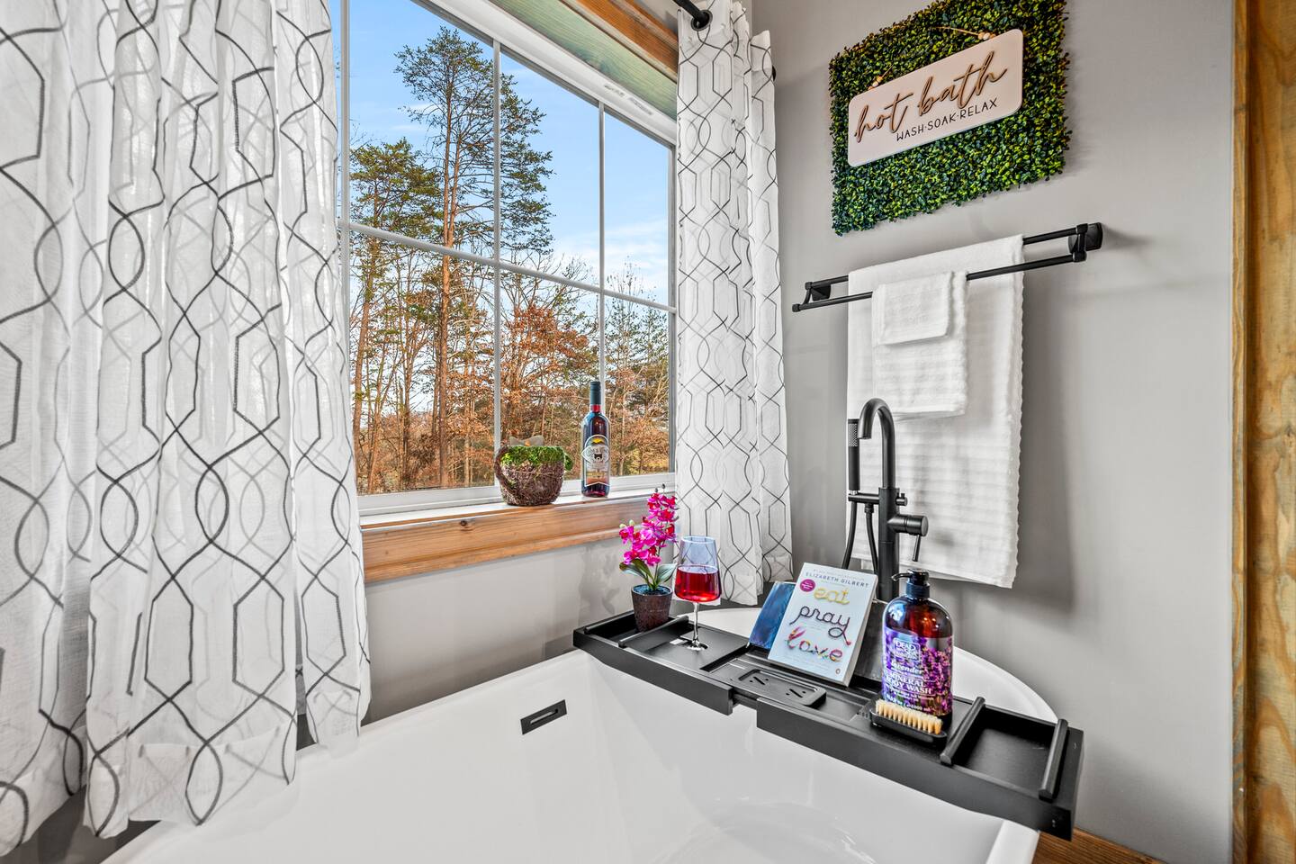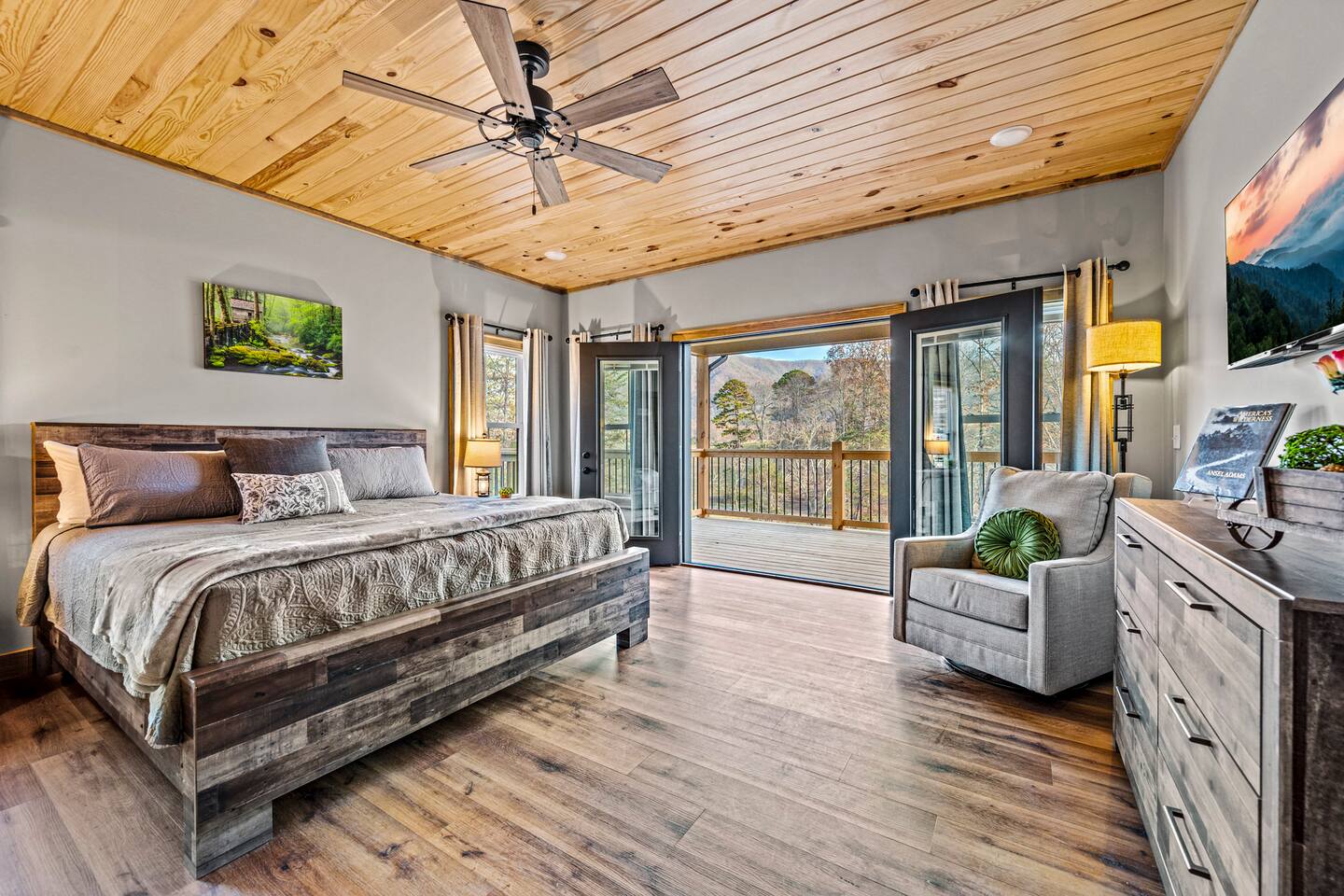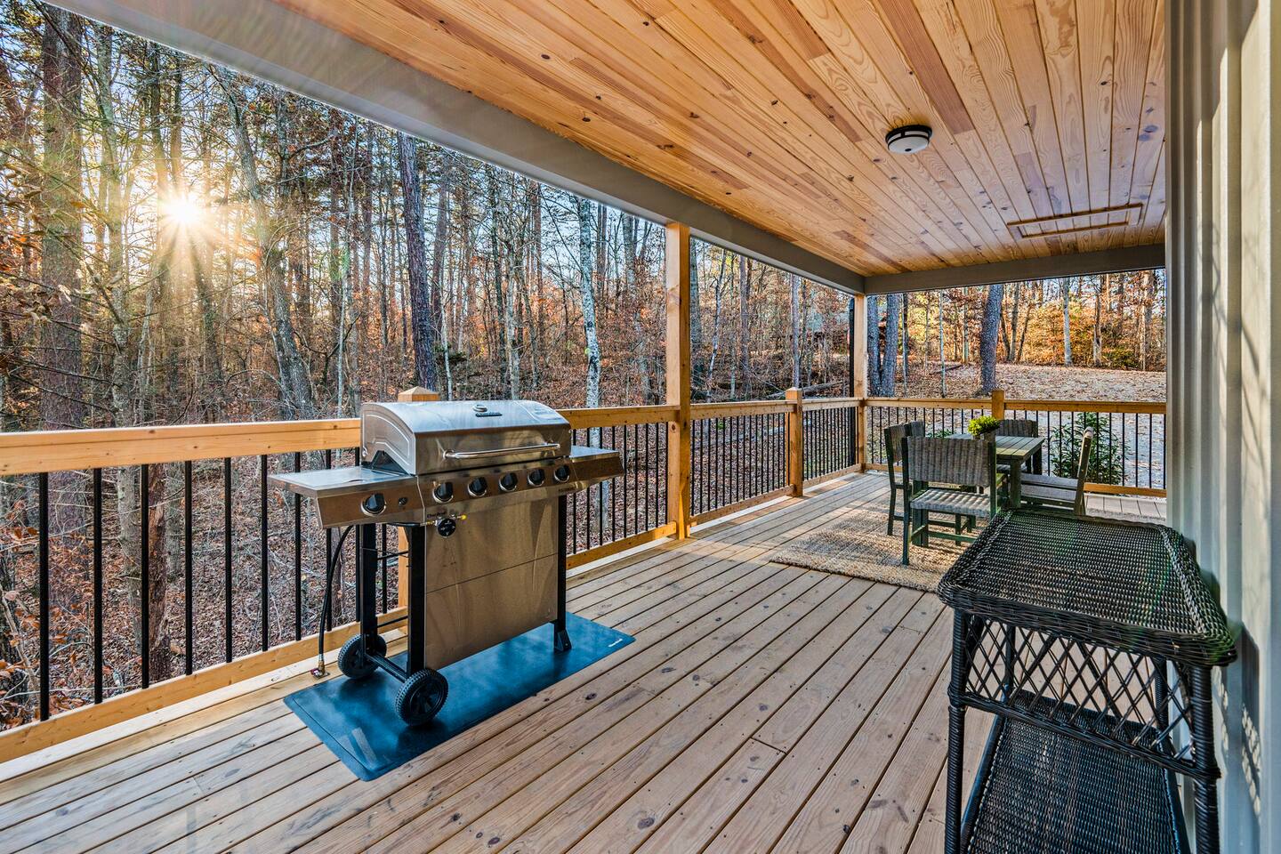 ABOUT OUR CABIN... As you enter the cabin, you'll see a GOURMET KITCHEN to the left and an open living space directly ahead. You'll be welcomed by large picture windows, offering breathtaking panoramic views of the beautiful mountains surrounding Wears Valley. UPSCALE DECOR...Throughout the cabin you'll find exceptional canvas art photography by Bill Lea, a National Geographic photographer and local resident. All furnishings and amenities are NEW since opening our doors in December 2023 and purchased from local artisans and vendors. LIVING ROOM: Gather with friends and loved ones in this spacious room, with amazing views of the surrounding mountains. As you relax on comfortable leather and fabric sofas, you'll enjoy our 65" 4K Smart ROKU TV, equipped with a JBL Soundbar and Subwoofer for an immersive sound experience. Perfect for streaming your favorite shows or movies. On cooler nights, relax in this comfortable room in front of the gas fireplace under the cozy throws provided. The sleeper sofa in this room provides an extra Queen bed. You'll find all the necessary pillows, and bedding in the mango wood cabinet in the entryway. KITCHEN/DINING: The open floorplan leads to a cozy dining area adjacent to the living room. The dining table offers 4 chairs and a dining bench that easily seats 6-7. The nearby kitchen bar has 4 stools, for additional seating. A booster seat can be found in the laundry room for our younger guests. The gourmet kitchen is equipped with Caphalon Select cookware as well as an All-Clad Turkey Roaster big enough for cooking a 25-lb turkey for the holidays! In addition, you'll find all your favorite small appliances like a waffle maker, blender, crock pot, and rice cooker. Complimentary pantry items include a small supply of K-cups and Tea, coffee filters, Sugar, Salt, Pepper, Cooking Oil, Pam Spray, a variety of herbs and spices, Foil, Saran Wrap, Wax Paper, etc. Your family will have ample dishes, server ware, and utensils for meals or snacks. COMFORTABLE BEDROOMS (3): *KING Bedroom - This spacious FIRST FLOOR suite includes a private bathroom, six-drawer dresser, luggage rack, and 43-inch 4K ROKU TV for streaming your favorite shows/movies. Each of the bedside lamps is equipped with night lights and USB chargers. This room includes blackout curtains and a quiet ceiling fan for your comfort. French doors lead out to the deck, with panoramic views of Wears Valley. Note: The closet in this bedroom is reserved for the owners only. The private bathroom features a double sink, walk-in shower, and a free-standing soaking tub. Amenities include lush linens, a bath caddy, travel size soap, shampoo, and conditioner, and two rolls of toilet paper. *Queen Bedroom - This quiet SECOND FLOOR room offers a custom closet for storing your belongings, a luggage rack, and a 32-inch HD Smart ROKU TV for streaming your favorite shows/movies. The nightstands offer additional drawers for storage and lamps with night lights and USB chargers. The huge picture window is dressed with blackout curtains and looks out onto the valley and mountains. A private entrance to the SHARED hall bathroom reveals a spacious layout with double vanity and a shower/tub combo with a sliding shower door. *Twin Room - This cozy SECOND FLOOR room is furnished with two Twin Trundle beds, providing a total of four twin beds. Each bed has a Serta 3" DuoCool Gel Memory Foam mattress. Extra pillows and bedding can be found in the tufted cushion chest. Our younger guests will enjoy the cozy alcove that includes a sofa chair, reading lamp, books, cards, games, and puzzles. This room also has blackout curtains, a quiet ceiling fan, and a large closet for storing your belongings. NOTE: This room does NOT have a TV. *Queen Sleeper Sofa - On the lower level, you'll find a Queen sleeper sofa in the main living area. Bedding can be found in the mango chest located in the foyer. GAME ROOM-LOFT AREA: Your entire family will enjoy the game room located in the second floor loft area. Here you'll find a unique "cocktail style" Barrel Arcade with two chairs and loaded with 60 classic arcade games! This game room also includes a Foosball table, a wall-mounted Connect Four game, and several popular board and card games. It's the perfect place for Family Game Night or rainy day activities! OUTDOOR LIVING Our guests rave about the wrap-around, 958 sq ft deck offering panoramic views of Wears Valley and Cades Mountain. The covered deck includes a complimentary gas grill and a spacious Acacia wood dining table with seating for 6. The perfect place for a game of cards after dinner! Enjoy fireside chats into the night as you relax on cushioned furniture surrounding a gas FIRE PIT TABLE. The deck also offers a string of Edison lights (set on a timer to come on 5 pm to 11 pm daily). No stay is complete until you relax in the 3-person HOT TUB, situated in the corner with amazing views of the mountains. The hot tub is equipped with Bluetooth speakers and subwoofers; Waterfall Neck, Shoulder, Calf, and Foot Jets; Cushioned Headrests; and two reclining seats and a bench. ** Never run out of propane while grilling or enjoying the fire pit table. We are connected to a 100-gallon LP gas tank. OUTDOOR LAWN SPACE: Our sprawling 0.57 acre lot offers lots of space for your family to enjoy the outdoors! Start a Corn Hole tournament or bring along a ball and glove to play catch! In the afternoon, curl up in our double Hammock for a nap or enjoy a book from our complimentary outdoor library stand, stocked with reading material for all ages. Our guests rave about our wood-burning outdoor fireplace. Stop at the nearby gas station on your way to the house and pick up a couple bundles of wood for a relaxing evening by the fire. Its the perfect place to socialize with friends and family. (Four Adirondack chairs provided) WAIT THERE'S MORE... The first floor laundry room is equipped with a washer, dryer, iron, and ironing board. You'll also find a toddler booste