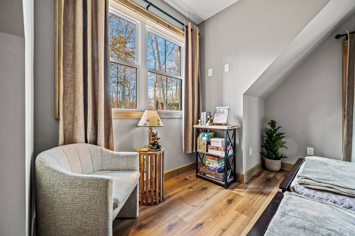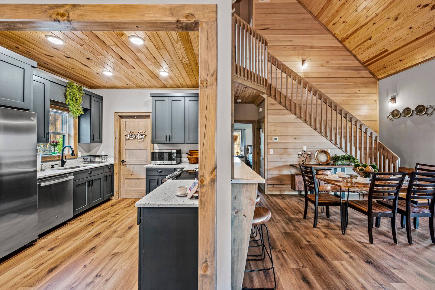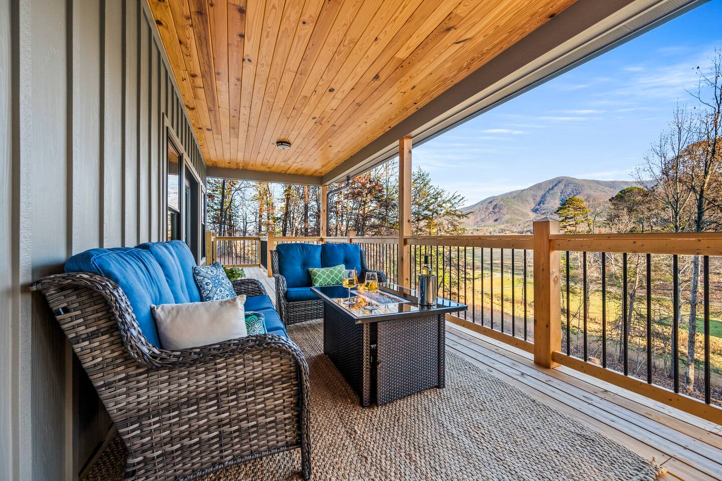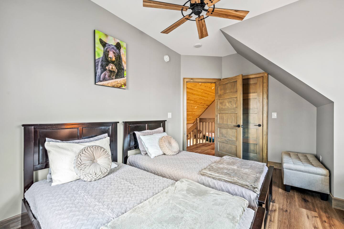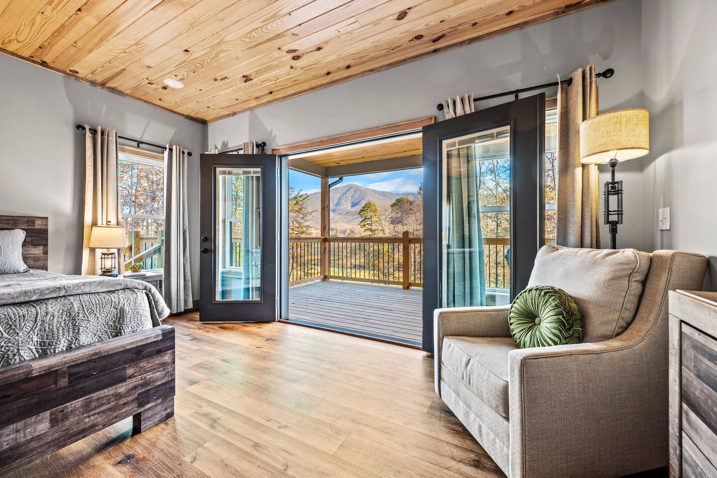 ABOUT OUR CABIN... As you enter the cabin, you'll see a GOURMET KITCHEN to the left and an open living space directly ahead. You'll be welcomed by large picture windows, offering breathtaking panoramic views of the beautiful mountains surrounding Wears Valley. UPSCALE DECOR...Throughout the cabin you'll find exceptional canvas art photography by Bill Lea, a National Geographic photographer and local resident. All furnishings and amenities are NEW since opening our doors in December 2023 and purchased from local artisans and vendors. LIVING ROOM: Gather with friends and loved ones in this spacious room, with amazing views of the surrounding mountains. As you relax on comfortable leather and fabric sofas, you'll enjoy our 65" 4K Smart ROKU TV, equipped with a JBL Soundbar and Subwoofer for an immersive sound experience. Perfect for streaming your favorite shows or movies. On cooler nights, relax in this comfortable room in front of the gas fireplace under the cozy throws provided. The sleeper sofa in this room provides an extra Queen bed. You'll find all the necessary pillows, and bedding in the mango wood cabinet in the entryway. KITCHEN/DINING: The open floorplan leads to a cozy dining area adjacent to the living room. The dining table offers 4 chairs and a dining bench that easily seats 6-7. The nearby kitchen bar has 4 stools, for additional seating. A booster seat can be found in the laundry room for our younger guests. The gourmet kitchen is equipped with Caphalon Select cookware as well as an All-Clad Turkey Roaster big enough for cooking a 25-lb turkey for the holidays! In addition, you'll find all your favorite small appliances like a waffle maker, blender, crock pot, and rice cooker. Complimentary pantry items include a small supply of K-cups and Tea, coffee filters, Sugar, Salt, Pepper, Cooking Oil, Pam Spray, a variety of herbs and spices, Foil, Saran Wrap, Wax Paper, etc. Your family will have ample dishes, server ware, and utensils for meals or snacks. COMFORTABLE BEDROOMS (3): *KING Bedroom - This spacious FIRST FLOOR suite includes a private bathroom, six-drawer dresser, luggage rack, and 43-inch 4K ROKU TV for streaming your favorite shows/movies. Each of the bedside lamps is equipped with night lights and USB chargers. This room includes blackout curtains and a quiet ceiling fan for your comfort. French doors lead out to the deck, with panoramic views of Wears Valley. Note: The closet in this bedroom is reserved for the owners only. The private bathroom features a double sink, walk-in shower, and a free-standing soaking tub. Amenities include lush linens, a bath caddy, travel size soap, shampoo, and conditioner, and two rolls of toilet paper. *Queen Bedroom - This quiet SECOND FLOOR room offers a custom closet for storing your belongings, a luggage rack, and a 32-inch HD Smart ROKU TV for streaming your favorite shows/movies. The nightstands offer additional drawers for storage and lamps with night lights and USB chargers. The huge picture window is dressed with blackout curtains and looks out onto the valley and mountains. A private entrance to the SHARED hall bathroom reveals a spacious layout with double vanity and a shower/tub combo with a sliding shower door. *Twin Room - This cozy SECOND FLOOR room is furnished with two Twin Trundle beds, providing a total of four twin beds. Each bed has a Serta 3" DuoCool Gel Memory Foam mattress. Extra pillows and bedding can be found in the tufted cushion chest. Our younger guests will enjoy the cozy alcove that includes a sofa chair, reading lamp, books, cards, games, and puzzles. This room also has blackout curtains, a quiet ceiling fan, and a large closet for storing your belongings. NOTE: This room does NOT have a TV. *Queen Sleeper Sofa - On the lower level, you'll find a Queen sleeper sofa in the main living area. Bedding can be found in the mango chest located in the foyer. GAME ROOM-LOFT AREA: Your entire family will enjoy the game room located in the second floor loft area. Here you'll find a unique "cocktail style" Barrel Arcade with two chairs and loaded with 60 classic arcade games! This game room also includes a Foosball table, a wall-mounted Connect Four game, and several popular board and card games. It's the perfect place for Family Game Night or rainy day activities! OUTDOOR LIVING Our guests rave about the wrap-around, 958 sq ft deck offering panoramic views of Wears Valley and Cades Mountain. The covered deck includes a complimentary gas grill and a spacious Acacia wood dining table with seating for 6. The perfect place for a game of cards after dinner! Enjoy fireside chats into the night as you relax on cushioned furniture surrounding a gas FIRE PIT TABLE. The deck also offers a string of Edison lights (set on a timer to come on 5 pm to 11 pm daily). No stay is complete until you relax in the 3-person HOT TUB, situated in the corner with amazing views of the mountains. The hot tub is equipped with Bluetooth speakers and subwoofers; Waterfall Neck, Shoulder, Calf, and Foot Jets; Cushioned Headrests; and two reclining seats and a bench. ** Never run out of propane while grilling or enjoying the fire pit table. We are connected to a 100-gallon LP gas tank. OUTDOOR LAWN SPACE: Our sprawling 0.57 acre lot offers lots of space for your family to enjoy the outdoors! Start a Corn Hole tournament or bring along a ball and glove to play catch! In the afternoon, curl up in our double Hammock for a nap or enjoy a book from our complimentary outdoor library stand, stocked with reading material for all ages. Our guests rave about our wood-burning outdoor fireplace. Stop at the nearby gas station on your way to the house and pick up a couple bundles of wood for a relaxing evening by the fire. Its the perfect place to socialize with friends and family. (Four Adirondack chairs provided) WAIT THERE'S MORE... The first floor laundry room is equipped with a washer, dryer, iron, and ironing board. You'll also find a toddler booste