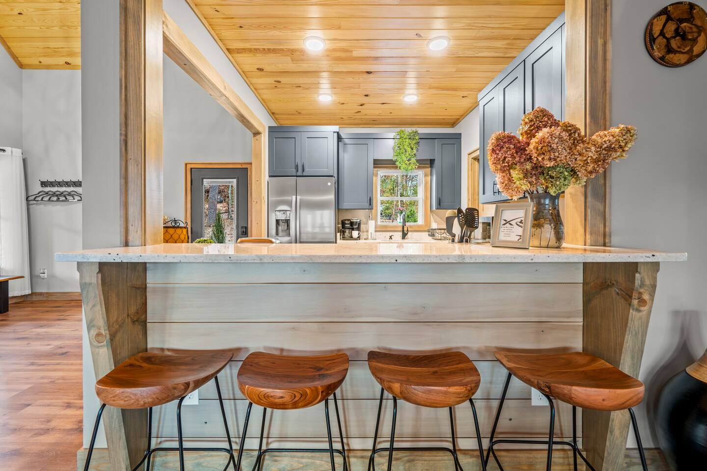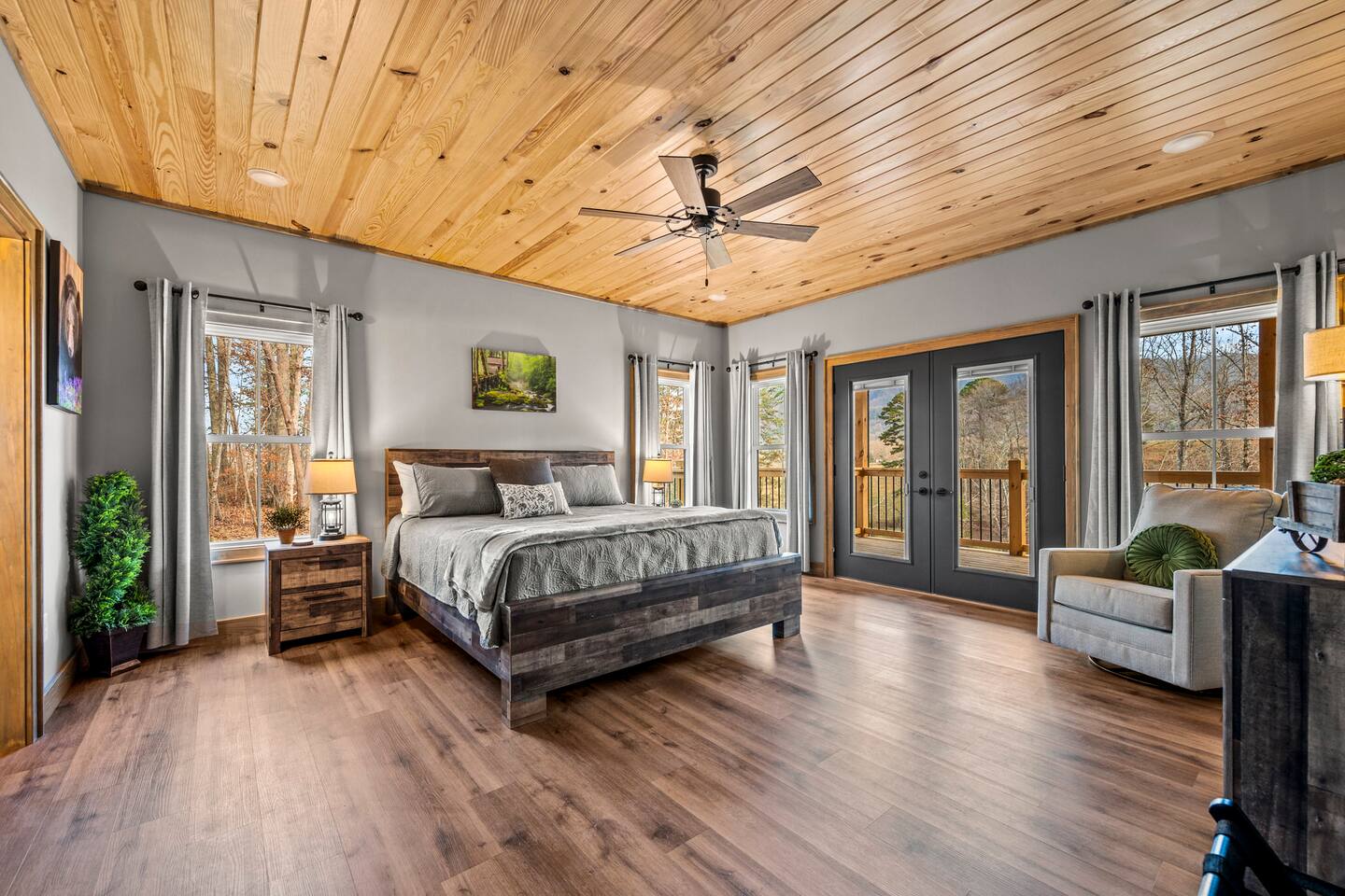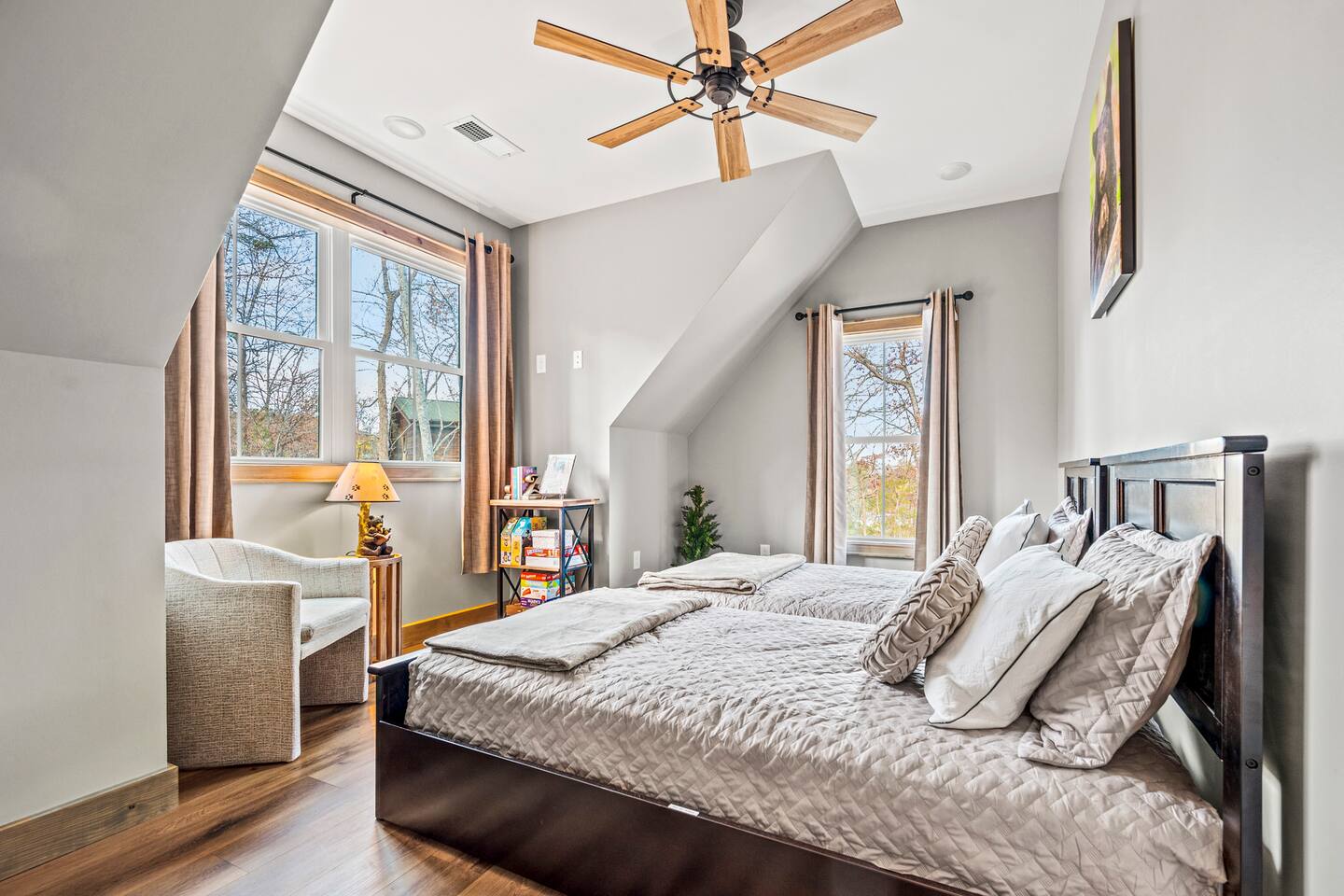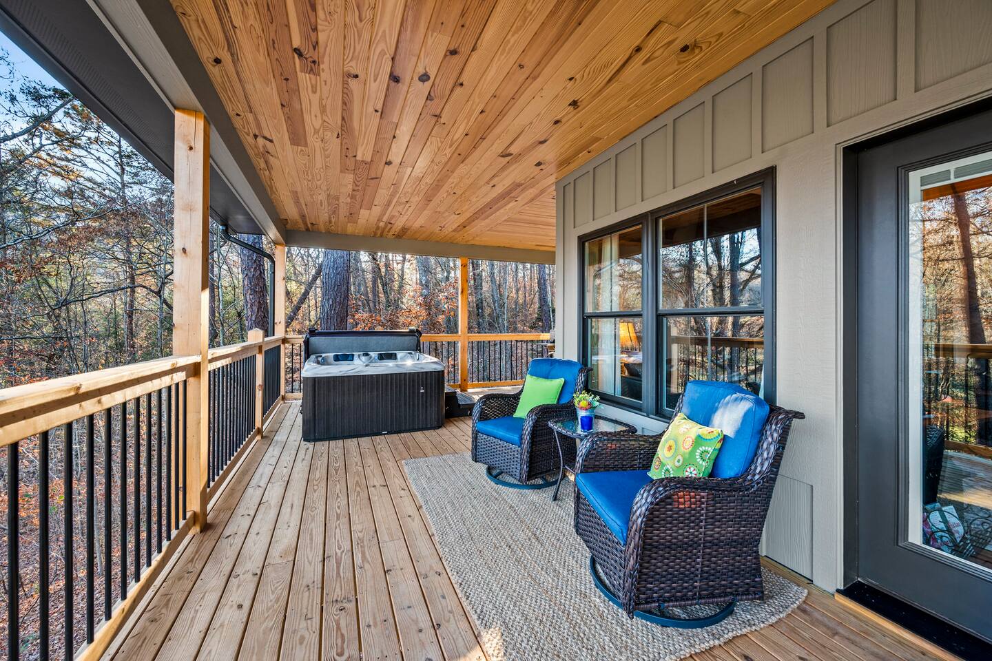 ABOUT OUR CABIN... As you enter the cabin, you'll see a GOURMET KITCHEN to the left and an open living space directly ahead. You'll be welcomed by large picture windows, offering breathtaking panoramic views of the beautiful mountains surrounding Wears Valley. UPSCALE DECOR...Throughout the cabin you'll find exceptional canvas art photography by Bill Lea, a National Geographic photographer and local resident. All furnishings and amenities are NEW since opening our doors in December 2023 and purchased from local artisans and vendors. LIVING ROOM: Gather with friends and loved ones in this spacious room, with amazing views of the surrounding mountains. As you relax on comfortable leather and fabric sofas, you'll enjoy our 65" 4K Smart ROKU TV, equipped with a JBL Soundbar and Subwoofer for an immersive sound experience. Perfect for streaming your favorite shows or movies. On cooler nights, relax in this comfortable room in front of the gas fireplace under the cozy throws provided. The sleeper sofa in this room provides an extra Queen bed. You'll find all the necessary pillows, and bedding in the mango wood cabinet in the entryway. KITCHEN/DINING: The open floorplan leads to a cozy dining area adjacent to the living room. The dining table offers 4 chairs and a dining bench that easily seats 6-7. The nearby kitchen bar has 4 stools, for additional seating. A booster seat can be found in the laundry room for our younger guests. The gourmet kitchen is equipped with Caphalon Select cookware as well as an All-Clad Turkey Roaster big enough for cooking a 25-lb turkey for the holidays! In addition, you'll find all your favorite small appliances like a waffle maker, blender, crock pot, and rice cooker. Complimentary pantry items include a small supply of K-cups and Tea, coffee filters, Sugar, Salt, Pepper, Cooking Oil, Pam Spray, a variety of herbs and spices, Foil, Saran Wrap, Wax Paper, etc. Your family will have ample dishes, server ware, and utensils for meals or snacks. COMFORTABLE BEDROOMS (3): *KING Bedroom - This spacious FIRST FLOOR suite includes a private bathroom, six-drawer dresser, luggage rack, and 43-inch 4K ROKU TV for streaming your favorite shows/movies. Each of the bedside lamps is equipped with night lights and USB chargers. This room includes blackout curtains and a quiet ceiling fan for your comfort. French doors lead out to the deck, with panoramic views of Wears Valley. Note: The closet in this bedroom is reserved for the owners only. The private bathroom features a double sink, walk-in shower, and a free-standing soaking tub. Amenities include lush linens, a bath caddy, travel size soap, shampoo, and conditioner, and two rolls of toilet paper. *Queen Bedroom - This quiet SECOND FLOOR room offers a custom closet for storing your belongings, a luggage rack, and a 32-inch HD Smart ROKU TV for streaming your favorite shows/movies. The nightstands offer additional drawers for storage and lamps with night lights and USB chargers. The huge picture window is dressed with blackout curtains and looks out onto the valley and mountains. A private entrance to the SHARED hall bathroom reveals a spacious layout with double vanity and a shower/tub combo with a sliding shower door. *Twin Room - This cozy SECOND FLOOR room is furnished with two Twin Trundle beds, providing a total of four twin beds. Each bed has a Serta 3" DuoCool Gel Memory Foam mattress. Extra pillows and bedding can be found in the tufted cushion chest. Our younger guests will enjoy the cozy alcove that includes a sofa chair, reading lamp, books, cards, games, and puzzles. This room also has blackout curtains, a quiet ceiling fan, and a large closet for storing your belongings. NOTE: This room does NOT have a TV. *Queen Sleeper Sofa - On the lower level, you'll find a Queen sleeper sofa in the main living area. Bedding can be found in the mango chest located in the foyer. GAME ROOM-LOFT AREA: Your entire family will enjoy the game room located in the second floor loft area. Here you'll find a unique "cocktail style" Barrel Arcade with two chairs and loaded with 60 classic arcade games! This game room also includes a Foosball table, a wall-mounted Connect Four game, and several popular board and card games. It's the perfect place for Family Game Night or rainy day activities! OUTDOOR LIVING Our guests rave about the wrap-around, 958 sq ft deck offering panoramic views of Wears Valley and Cades Mountain. The covered deck includes a complimentary gas grill and a spacious Acacia wood dining table with seating for 6. The perfect place for a game of cards after dinner! Enjoy fireside chats into the night as you relax on cushioned furniture surrounding a gas FIRE PIT TABLE. The deck also offers a string of Edison lights (set on a timer to come on 5 pm to 11 pm daily). No stay is complete until you relax in the 3-person HOT TUB, situated in the corner with amazing views of the mountains. The hot tub is equipped with Bluetooth speakers and subwoofers; Waterfall Neck, Shoulder, Calf, and Foot Jets; Cushioned Headrests; and two reclining seats and a bench. ** Never run out of propane while grilling or enjoying the fire pit table. We are connected to a 100-gallon LP gas tank. OUTDOOR LAWN SPACE: Our sprawling 0.57 acre lot offers lots of space for your family to enjoy the outdoors! Start a Corn Hole tournament or bring along a ball and glove to play catch! In the afternoon, curl up in our double Hammock for a nap or enjoy a book from our complimentary outdoor library stand, stocked with reading material for all ages. Our guests rave about our wood-burning outdoor fireplace. Stop at the nearby gas station on your way to the house and pick up a couple bundles of wood for a relaxing evening by the fire. Its the perfect place to socialize with friends and family. (Four Adirondack chairs provided) WAIT THERE'S MORE... The first floor laundry room is equipped with a washer, dryer, iron, and ironing board. You'll also find a toddler booste