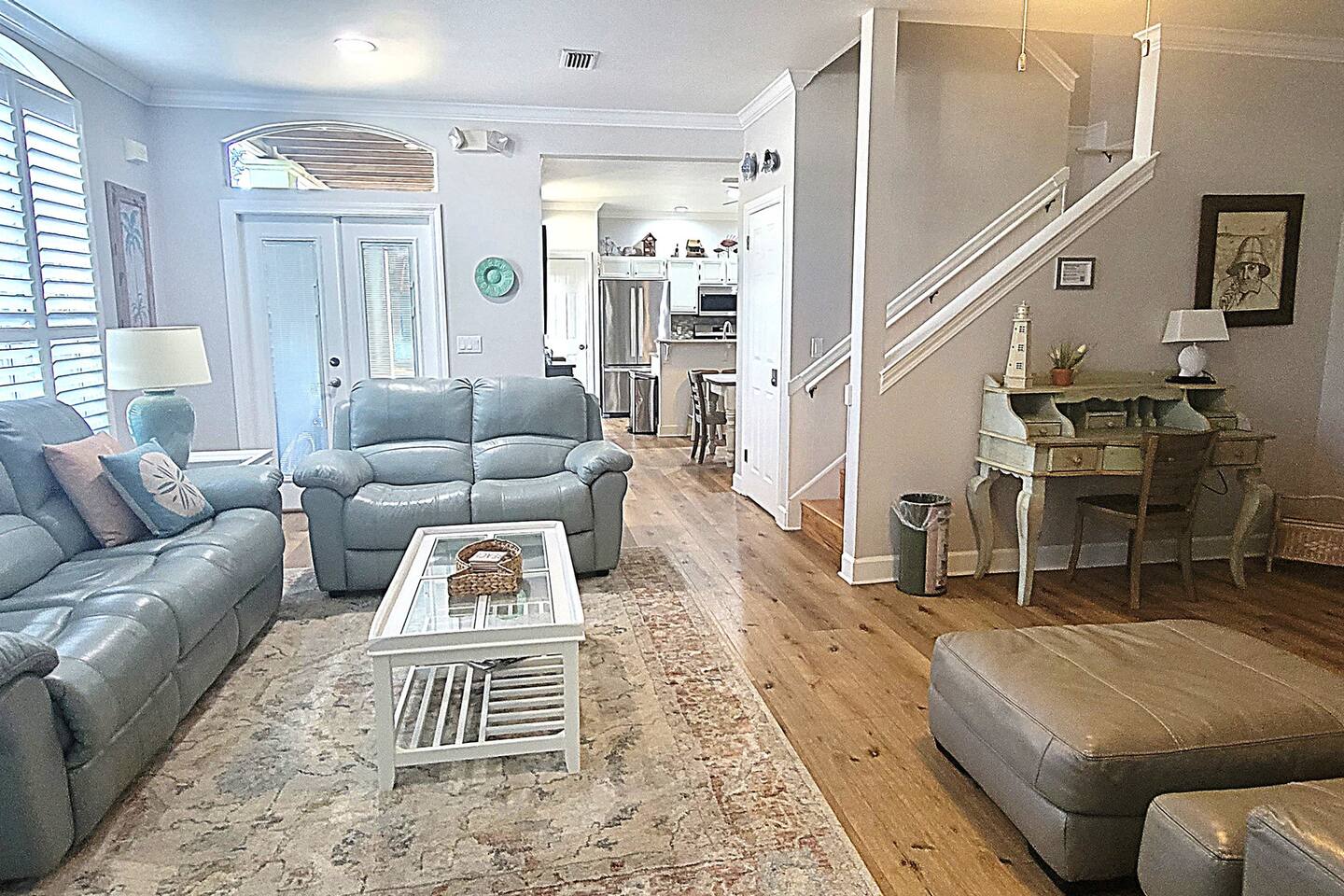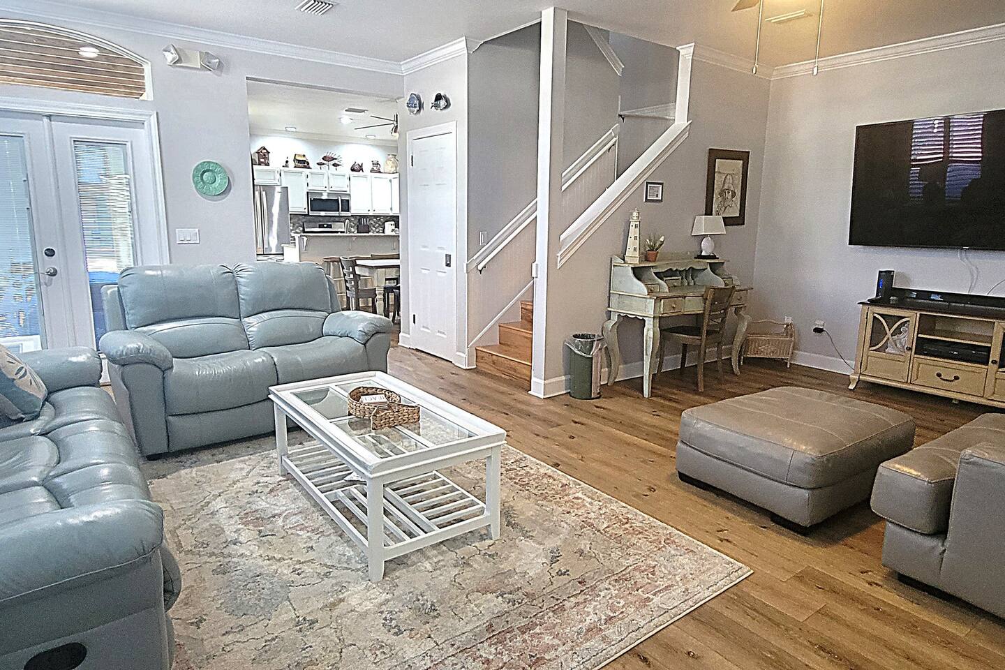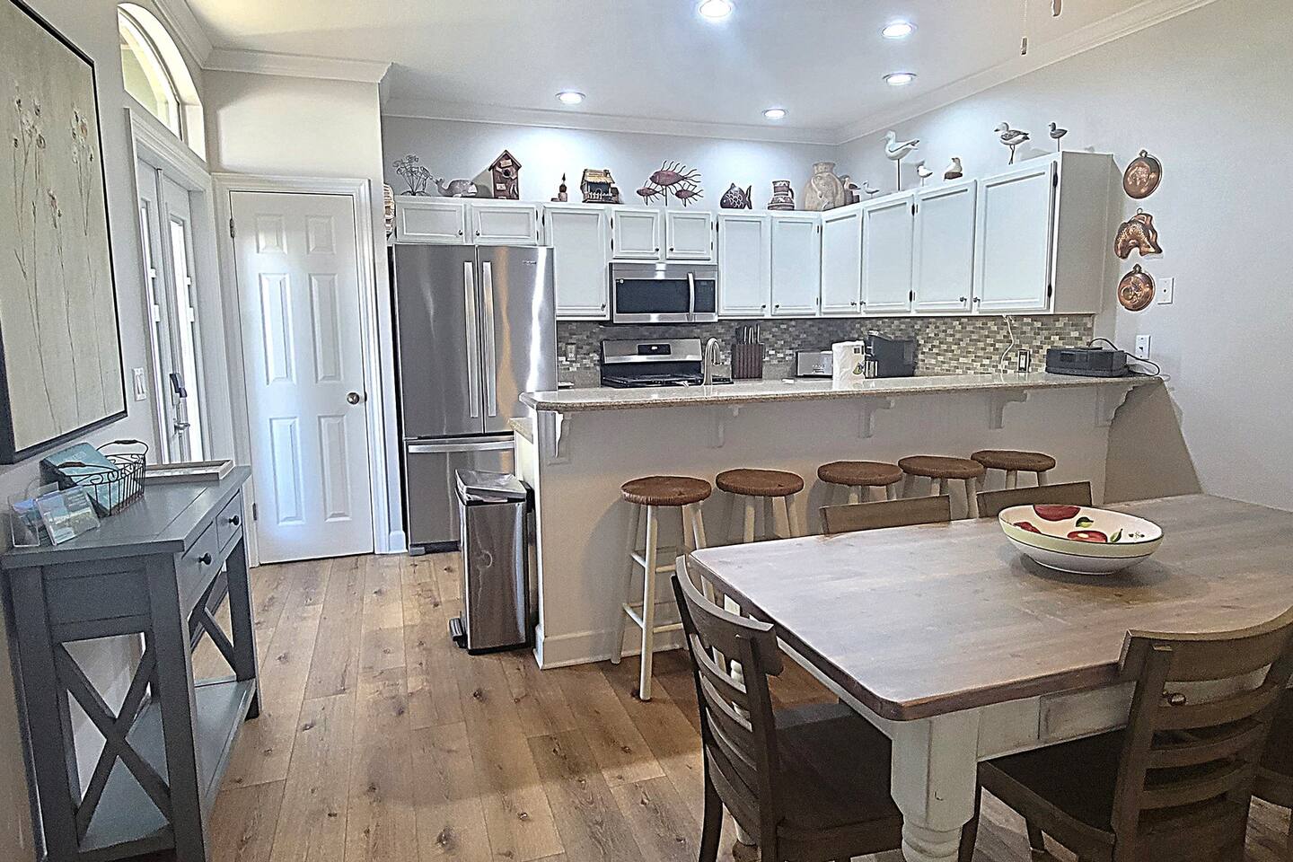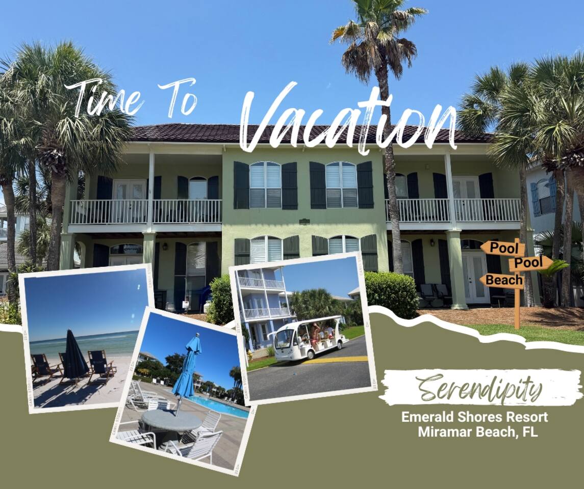 ABOUT SERENDIPITY... This beautifully furnished beach house is located on the corner of a quiet cul-de-sac, surrounded by lush tropical landscaping, just steps from the Emerald Shores community pool and private beach! LIVING AREAS (2): Relax in the comfortable first-floor living area and enjoy our 75" HD LCD SMART TV with soundbar! Enjoy all your favorite streaming services or catch your favorite shows on our High Def Cable Box, with DVR. Or...head upstairs and enjoy the den/loft area which has a 40" LCD TV with high definition channels (this living area also has a comfortable sleeper sofa) KITCHEN/DINING AREA: As you enter our home, you will be greeted with a spacious, newly remodeled kitchen and adjacent dining area. The kitchen has been fully-stocked with all your favorite cooking tools and small appliances. Don't see what you need? Let us know and we'll send it over! The dining area is separated from the kitchen by a counter with stools, creating the perfect space to hang out with friends and family. Whether it's meal time or game night, this area will be well-used by your group! WHERE YOU'LL SLEEP: This home's sprawling layout includes a first floor King suite with a private patio. Upstairs you'll find two additional KING Bedrooms and a sleeper sofa in the loft area. On the first floor we keep two comfortable rollaway twin beds with bedding - perfect for a couple extra guests. (Max Occ 8-10 guests) All bedrooms have ceiling fans, comfortable bedding, and Smart TVs, creating the perfect private retreat! Note: We do not have a pack-and-play or crib on site. We can recommend a local company if you wish to rent one during your stay. (2) KING Ensuite Bedrooms (One on each floor) (1) KING Bedroom (2nd floor) (1) QUEEN Sleeper Sofa (located in the upstairs den/loft area) (2) Oversized TWIN rollaway cots ENJOY THE OUTDOORS Head outside during your stay and enjoy our two furnished porches on the lower level, with a complimentary grill. Or relax in the morning on either of our 2 upper balconies. All outdoor areas are furnished with comfortable seating. WAIT THERE'S MORE... The 2nd floor laundry room has a full size washer and dryer, iron/board, and a starter supply of detergent pods. On the porch you'll find a complimentary beach wagon to use for your day at the beach or the pool. OUR COMMUNITY When you stay at Serendipity, you'll enjoy all the amenities provided by the top-rated Emerald Shores resort community. This exquisite gated community sits between Hwy 98 and Scenic 98 in the Destin/Miramar Beach area. With entry gates on both ends, you'll have easy access to explore the neighboring areas along the Emerald Coast. EMERALD SHORES PRIVATE BEACH Take a short 5 minute stroll to our gated PRIVATE BEACH or hop on the complimentary beach tram (mid-May through mid-Aug). There you'll find the Emerald Shores snack bar pavilion with restrooms, rinse showers, picnic tables, and plenty of space to park your bikes or beach wagon. Check in with our DEDICATED beach attendant to reserve chairs or an umbrella (provided by La Dolce Vita). FUN FACT: Emerald Shores is the ONLY community on Scenic 98 with a private beach, a private pavilion with snack bar and restrooms, AND a dedicated beach attendant! (During high seasons, our snack bar, picnic tables, and private restrooms make our pavilion a true HIDDEN GEM!) * * * * * SEASONAL WRISTBAND POLICY: Upon your arrival, you will need to obtain wrist bands from the Emerald Shores Beach Pavilion in order to access the resort amenities, including the private beach. There is a $30 cost per stay that covers everyone in your group. Instructions on how to obtain your wrist bands will be provided after your reservation is made. ** EMERALD SHORES is a sought-after gated community offering two community pools, a private Beach and Beach Pavilion, our own dedicated beach attendant, a tennis/pickleball court, basketball court, and seasonal beach tram service. The community is centrally located close to restaurants, bars, shopping, golf courses, and water sports with access to both Hwy 98 on the north and Scenic 98 on the south! We're just minutes from Destin, known as the "Luckiest Fishing Village in the World" where deep sea fishing is always a big draw! The powder, white beaches and the sparkling Emerald Green waters give true meaning to the word, 'Paradise'! The Destin/Miramar Beach area is abundant with restaurants, bars, shopping areas, golf, and water sports. We invite you to come see why so many vacationers visit this area year after year!
