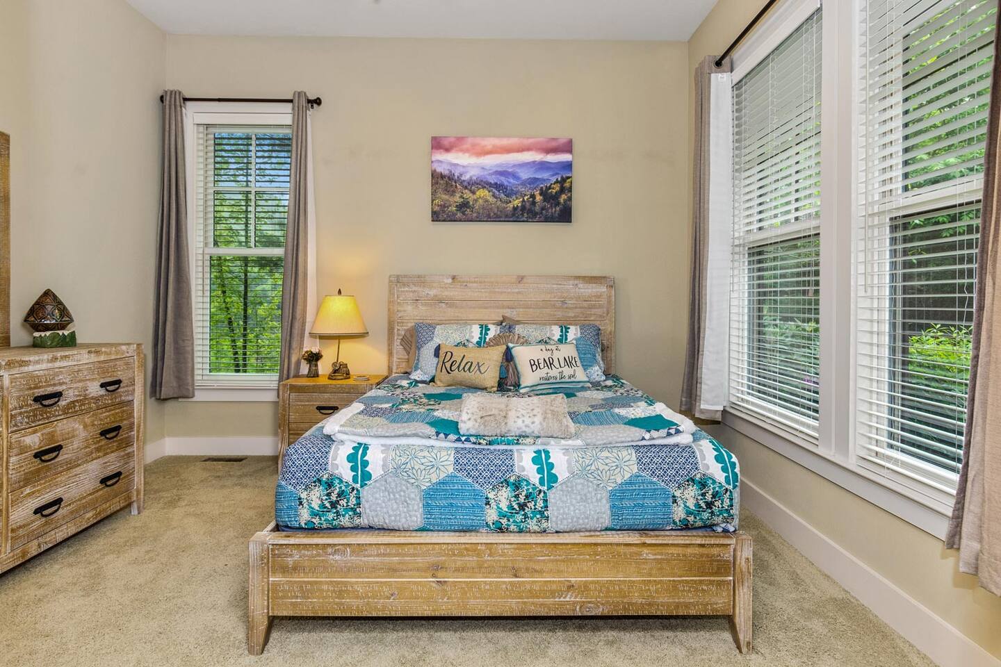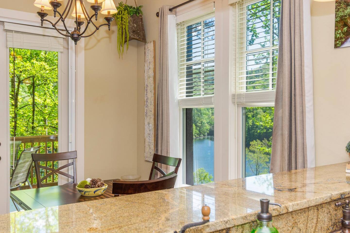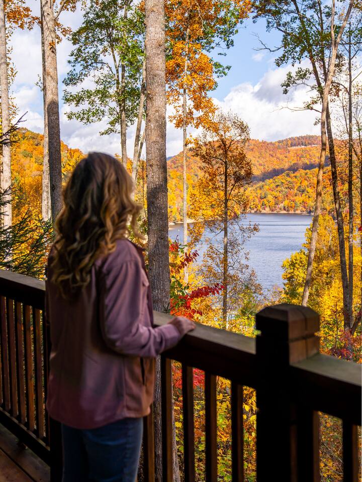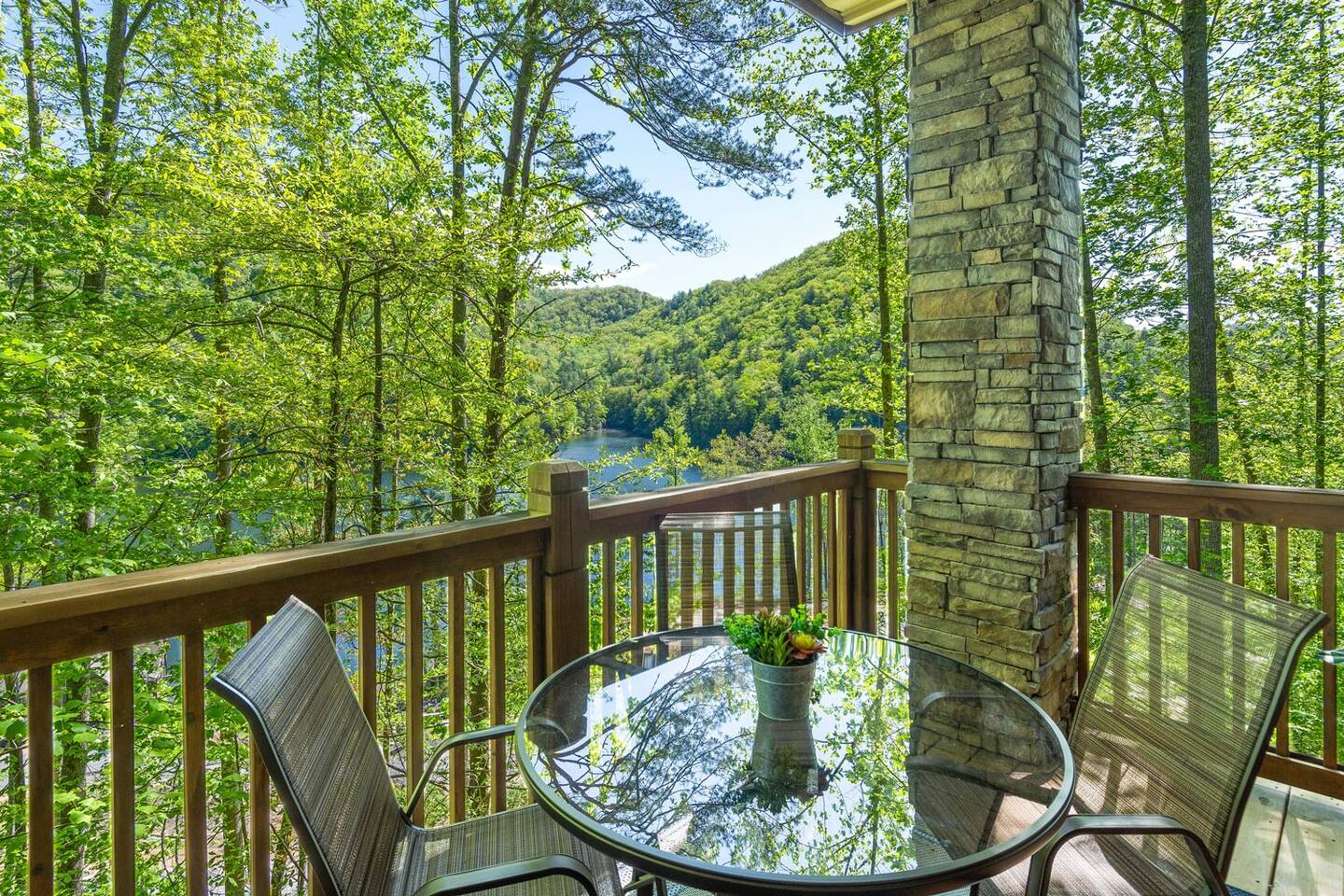 We look forward to welcoming you to Fables of the Forest, a top-rated condo fully-furnished with all the amenities needed to make your stay comfortable and memorable. * * The highlight of the cozy LIVING ROOM at this rustic mountain escape is the gas fireplace in the living room. Turn it on with the flick of a switch, grab a blanket and curl up with a good book as you enjoy the view of Bear Creek Lake from the windows. The heavy split-log, oak mantle holds a few of my favorite mementos. On both sides, the floating shelves are decorated with our family pictures, books, and portraits of mountain life by Susan Stanton. The colors are soothing and the windows provide breathtaking views of Bear Lake. The living room provides a comfortable pull-out Queen size bed that easily accommodates two additional guests. (Total Occupancy: 6) * * The DINING / KITCHEN area offers a spectacular view of the mountains and lake. The fully loaded kitchen is perfect for preparing meals or a late-night snack while you curl up in the living area. All appliances are top-of-the-line Whirlpool Gold, including a five-burner gas top cooking range. Plenty of dinnerware, serving ware, Calfalon pots and frying pans, Cuisinart knives. We have a Keurig coffee maker for your fresh morning cup of Joe. (Pods are not provided) Available in the pantry are a rice cooker, panini maker, citrus press, waffle maker, and more. The small square dining table seats four, but can easily be extended to accommodate six. ( Pull out the drop leaves, to make it round) * * The MAIN BEDROOM is furnished with a Queen bed with a thick memory foam mattress that will lull you to the Land of Nod. The colorful patch quilt, shams, and Sherpa blanket at the foot of the bed are from Lush Decor. The artsy lamps with intricate metal overlay are from Dutchman’s in Highlands, NC. Enjoy the view of the mountains and the sky from the comfort of your bed. You can walk out to the balcony from your bedroom. The dressers have six spacious drawers for your clothes and the nightstands each have two drawers. There is a modest walk-in closet with plenty of shelving, a luggage rack, and non-slip hangers. The attached full bathroom has a fully tiled glass-enclosed shower with a heavenly 10" Rain Shower Head with double sinks and granite countertops. * * The SECOND BEDROOM has a Queen bed with a thick memory foam mattress that ensures a restful night's sleep. The colorful patch quilt, shams, and Sherpa blanket at the foot of the bed are from Lush Decor. The whimsical fish tackle box lamp is from a local thrift store in downtown Sylva, NC. Enjoy the view of the lake and our beautiful "Secret Garden", from your window. The dressers have six spacious drawers for your clothes, and the single nightstand has two drawers. There is a modest closet with plenty of shelving, a luggage rack, and non-slip hangers. The attached full bathroom has a fully tiled tub/ shower combo with a heavenly 10" inch Rain Showerhead with a single sink and granite countertop. (There is a second door to this bathroom, which opens to the hallway.) * * Much of the decor and artwork was selected from our local shops and artists. We hope you take the time to visit the thriving artist community in the area. * *All TVs offer streaming service options. We do not subscribe to cable. Please bring login information to your favorite streaming services (Note: We love hosting families, but our condo is not furnished to accommodate small children. Please reach out to discuss) A LITTLE BIT ABOUT BEAR LAKE RESERVE: The LAKE CLUB is a short distance from our condo and has a full-service restaurant and bar - perfect for take-out, inside dining, or poolside dining. It also has two hot tubs, an infinity pool, kiddie pool with a slide, fitness center, private movie theater, relaxation lounge, and more. Towels are provided by the Lake Club, or you can grab the ones provided at our condo to take with you. The full-service LAKE CLUB MARINA offers both motorized and small craft rentals, from Pontoon boats to Paddleboards. Other options include jet skis, canoes, kayaks, and more! We recommend calling ahead to make a reservation. Upon your arrival, stop in at THE GREETER'S COTTAGE to get a list of activities planned during your stay. Everything from Family Game Night, Happy Hour Specials, S'mores Night, Sunset Lake Cruises...your stay will be filled with relaxing social activities! Bear Lake Reserve is known for having miles of captivating HIKING TRAILS throughout the resort. Grab a map at The Greeter's Cottage to venture out on your own, or join one of the Guided Hiking events and make some friends!