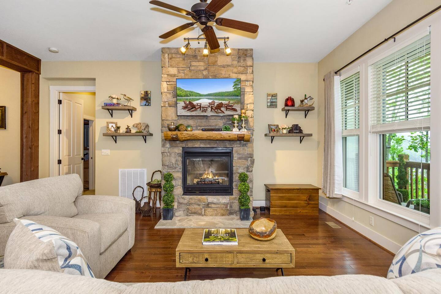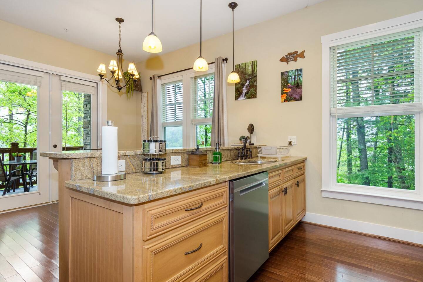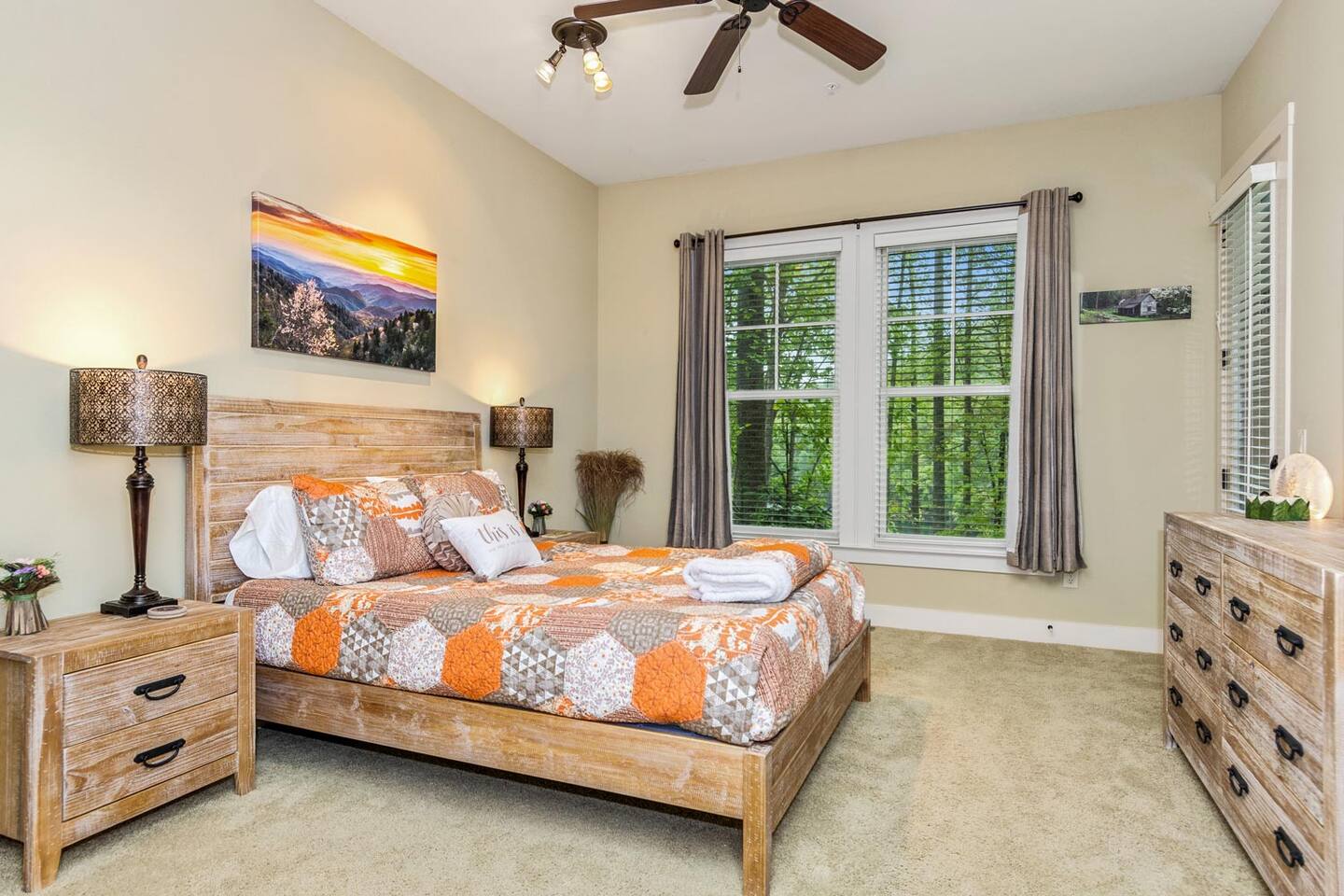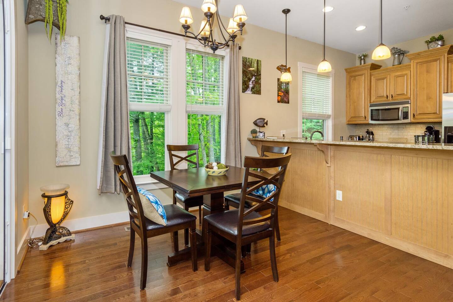 We look forward to welcoming you to Fables of the Forest, a top-rated condo fully-furnished with all the amenities needed to make your stay comfortable and memorable. * * The highlight of the cozy LIVING ROOM at this rustic mountain escape is the gas fireplace in the living room. Turn it on with the flick of a switch, grab a blanket and curl up with a good book as you enjoy the view of Bear Creek Lake from the windows. The heavy split-log, oak mantle holds a few of my favorite mementos. On both sides, the floating shelves are decorated with our family pictures, books, and portraits of mountain life by Susan Stanton. The colors are soothing and the windows provide breathtaking views of Bear Lake. The living room provides a comfortable pull-out Queen size bed that easily accommodates two additional guests. (Total Occupancy: 6) * * The DINING / KITCHEN area offers a spectacular view of the mountains and lake. The fully loaded kitchen is perfect for preparing meals or a late-night snack while you curl up in the living area. All appliances are top-of-the-line Whirlpool Gold, including a five-burner gas top cooking range. Plenty of dinnerware, serving ware, Calfalon pots and frying pans, Cuisinart knives. We have a Keurig coffee maker for your fresh morning cup of Joe. (Pods are not provided) Available in the pantry are a rice cooker, panini maker, citrus press, waffle maker, and more. The small square dining table seats four, but can easily be extended to accommodate six. ( Pull out the drop leaves, to make it round) * * The MAIN BEDROOM is furnished with a Queen bed with a thick memory foam mattress that will lull you to the Land of Nod. The colorful patch quilt, shams, and Sherpa blanket at the foot of the bed are from Lush Decor. The artsy lamps with intricate metal overlay are from Dutchman’s in Highlands, NC. Enjoy the view of the mountains and the sky from the comfort of your bed. You can walk out to the balcony from your bedroom. The dressers have six spacious drawers for your clothes and the nightstands each have two drawers. There is a modest walk-in closet with plenty of shelving, a luggage rack, and non-slip hangers. The attached full bathroom has a fully tiled glass-enclosed shower with a heavenly 10" Rain Shower Head with double sinks and granite countertops. * * The SECOND BEDROOM has a Queen bed with a thick memory foam mattress that ensures a restful night's sleep. The colorful patch quilt, shams, and Sherpa blanket at the foot of the bed are from Lush Decor. The whimsical fish tackle box lamp is from a local thrift store in downtown Sylva, NC. Enjoy the view of the lake and our beautiful "Secret Garden", from your window. The dressers have six spacious drawers for your clothes, and the single nightstand has two drawers. There is a modest closet with plenty of shelving, a luggage rack, and non-slip hangers. The attached full bathroom has a fully tiled tub/ shower combo with a heavenly 10" inch Rain Showerhead with a single sink and granite countertop. (There is a second door to this bathroom, which opens to the hallway.) * * Much of the decor and artwork was selected from our local shops and artists. We hope you take the time to visit the thriving artist community in the area. * *All TVs offer streaming service options. We do not subscribe to cable. Please bring login information to your favorite streaming services (Note: We love hosting families, but our condo is not furnished to accommodate small children. Please reach out to discuss) A LITTLE BIT ABOUT BEAR LAKE RESERVE: The LAKE CLUB is a short distance from our condo and has a full-service restaurant and bar - perfect for take-out, inside dining, or poolside dining. It also has two hot tubs, an infinity pool, kiddie pool with a slide, fitness center, private movie theater, relaxation lounge, and more. Towels are provided by the Lake Club, or you can grab the ones provided at our condo to take with you. The full-service LAKE CLUB MARINA offers both motorized and small craft rentals, from Pontoon boats to Paddleboards. Other options include jet skis, canoes, kayaks, and more! We recommend calling ahead to make a reservation. Upon your arrival, stop in at THE GREETER'S COTTAGE to get a list of activities planned during your stay. Everything from Family Game Night, Happy Hour Specials, S'mores Night, Sunset Lake Cruises...your stay will be filled with relaxing social activities! Bear Lake Reserve is known for having miles of captivating HIKING TRAILS throughout the resort. Grab a map at The Greeter's Cottage to venture out on your own, or join one of the Guided Hiking events and make some friends!