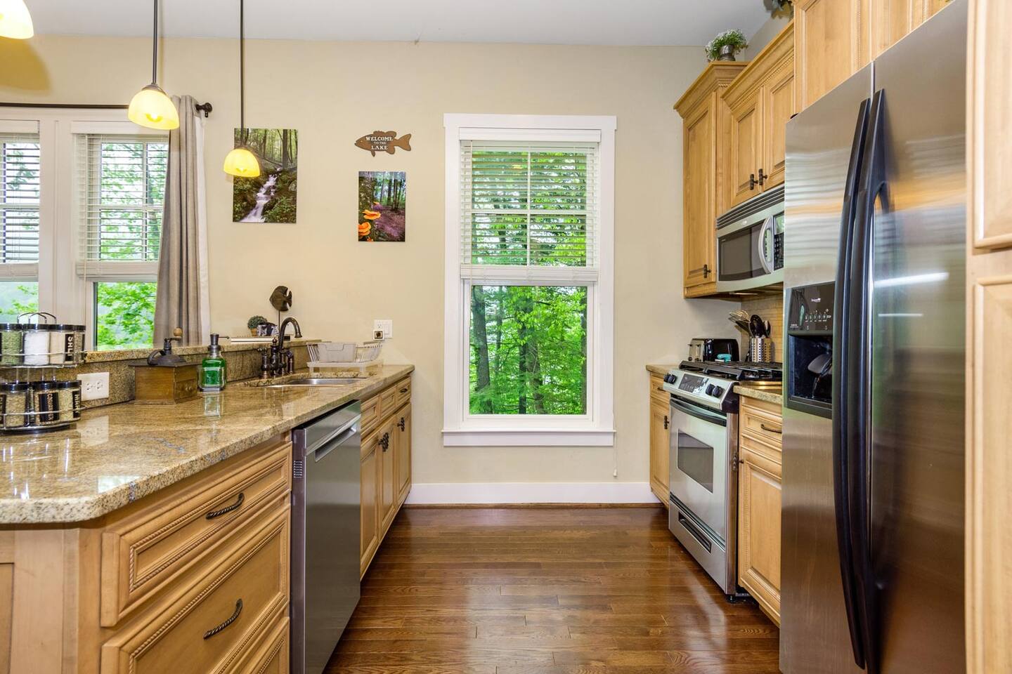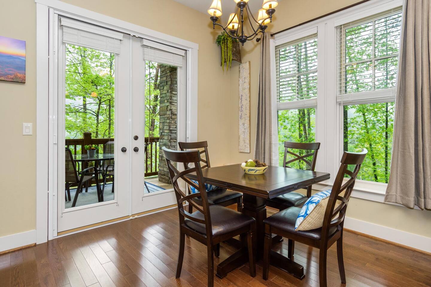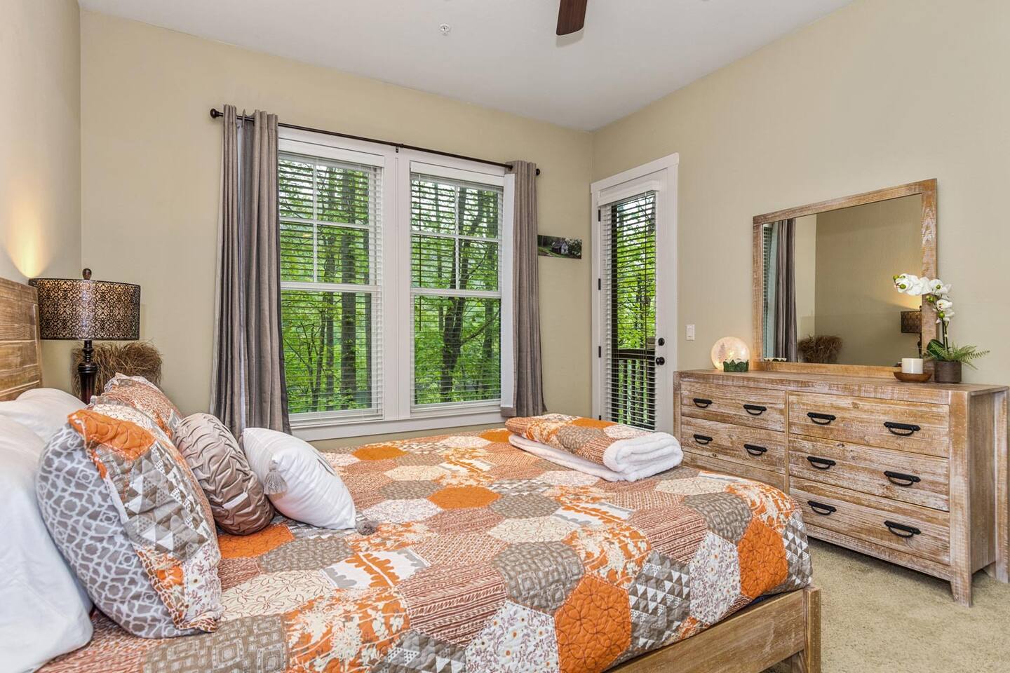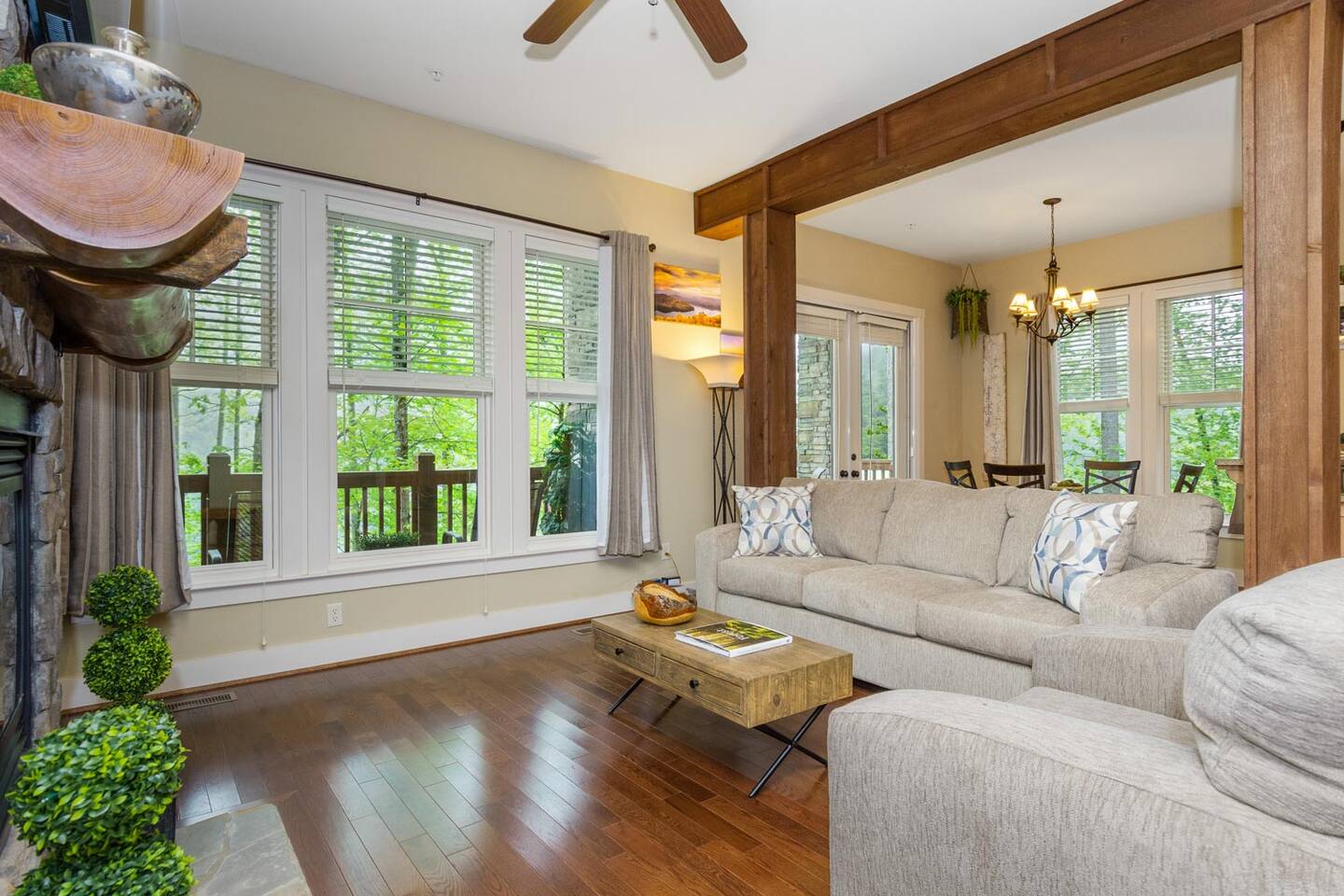We look forward to welcoming you to Fables of the Forest, a top-rated condo fully-furnished with all the amenities needed to make your stay comfortable and memorable. * * The highlight of the cozy LIVING ROOM at this rustic mountain escape is the gas fireplace in the living room. Turn it on with the flick of a switch, grab a blanket and curl up with a good book as you enjoy the view of Bear Creek Lake from the windows. The heavy split-log, oak mantle holds a few of my favorite mementos. On both sides, the floating shelves are decorated with our family pictures, books, and portraits of mountain life by Susan Stanton. The colors are soothing and the windows provide breathtaking views of Bear Lake. The living room provides a comfortable pull-out Queen size bed that easily accommodates two additional guests. (Total Occupancy: 6) * * The DINING / KITCHEN area offers a spectacular view of the mountains and lake. The fully loaded kitchen is perfect for preparing meals or a late-night snack while you curl up in the living area. All appliances are top-of-the-line Whirlpool Gold, including a five-burner gas top cooking range. Plenty of dinnerware, serving ware, Calfalon pots and frying pans, Cuisinart knives. We have a Keurig coffee maker for your fresh morning cup of Joe. (Pods are not provided) Available in the pantry are a rice cooker, panini maker, citrus press, waffle maker, and more. The small square dining table seats four, but can easily be extended to accommodate six. ( Pull out the drop leaves, to make it round) * * The MAIN BEDROOM is furnished with a Queen bed with a thick memory foam mattress that will lull you to the Land of Nod. The colorful patch quilt, shams, and Sherpa blanket at the foot of the bed are from Lush Decor. The artsy lamps with intricate metal overlay are from Dutchman’s in Highlands, NC. Enjoy the view of the mountains and the sky from the comfort of your bed. You can walk out to the balcony from your bedroom. The dressers have six spacious drawers for your clothes and the nightstands each have two drawers. There is a modest walk-in closet with plenty of shelving, a luggage rack, and non-slip hangers. The attached full bathroom has a fully tiled glass-enclosed shower with a heavenly 10" Rain Shower Head with double sinks and granite countertops. * * The SECOND BEDROOM has a Queen bed with a thick memory foam mattress that ensures a restful night's sleep. The colorful patch quilt, shams, and Sherpa blanket at the foot of the bed are from Lush Decor. The whimsical fish tackle box lamp is from a local thrift store in downtown Sylva, NC. Enjoy the view of the lake and our beautiful "Secret Garden", from your window. The dressers have six spacious drawers for your clothes, and the single nightstand has two drawers. There is a modest closet with plenty of shelving, a luggage rack, and non-slip hangers. The attached full bathroom has a fully tiled tub/ shower combo with a heavenly 10" inch Rain Showerhead with a single sink and granite countertop. (There is a second door to this bathroom, which opens to the hallway.) * * Much of the decor and artwork was selected from our local shops and artists. We hope you take the time to visit the thriving artist community in the area. * *All TVs offer streaming service options. We do not subscribe to cable. Please bring login information to your favorite streaming services (Note: We love hosting families, but our condo is not furnished to accommodate small children. Please reach out to discuss) A LITTLE BIT ABOUT BEAR LAKE RESERVE: The LAKE CLUB is a short distance from our condo and has a full-service restaurant and bar - perfect for take-out, inside dining, or poolside dining. It also has two hot tubs, an infinity pool, kiddie pool with a slide, fitness center, private movie theater, relaxation lounge, and more. Towels are provided by the Lake Club, or you can grab the ones provided at our condo to take with you. The full-service LAKE CLUB MARINA offers both motorized and small craft rentals, from Pontoon boats to Paddleboards. Other options include jet skis, canoes, kayaks, and more! We recommend calling ahead to make a reservation. Upon your arrival, stop in at THE GREETER'S COTTAGE to get a list of activities planned during your stay. Everything from Family Game Night, Happy Hour Specials, S'mores Night, Sunset Lake Cruises...your stay will be filled with relaxing social activities! Bear Lake Reserve is known for having miles of captivating HIKING TRAILS throughout the resort. Grab a map at The Greeter's Cottage to venture out on your own, or join one of the Guided Hiking events and make some friends!
